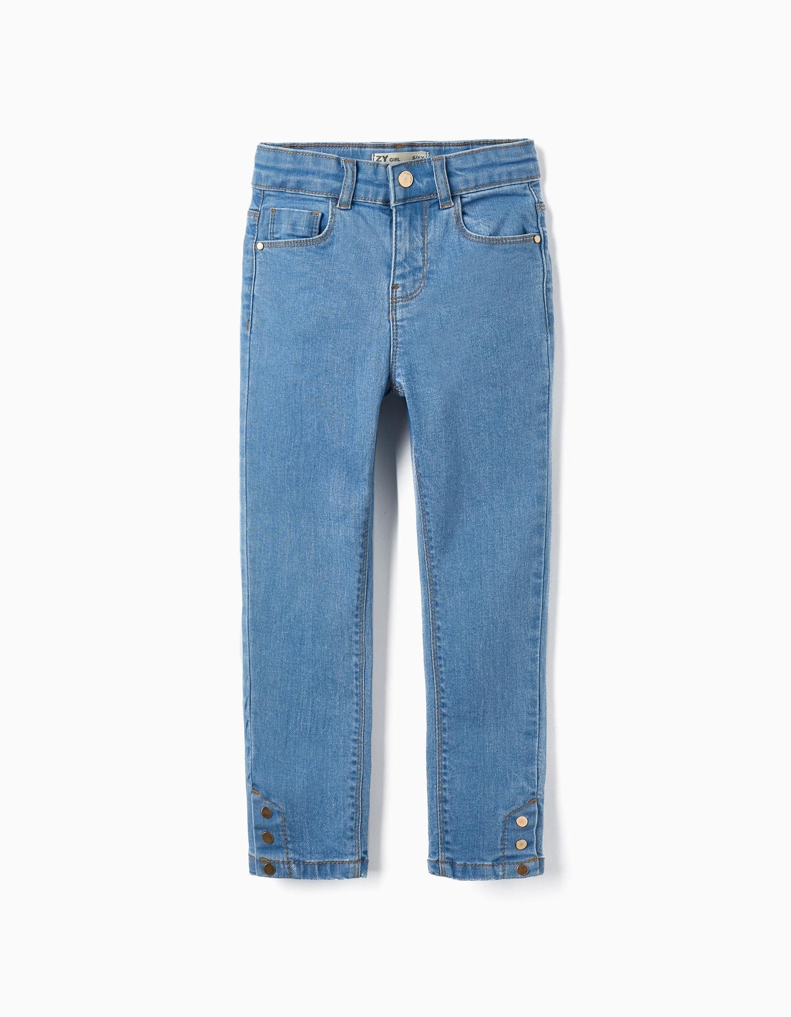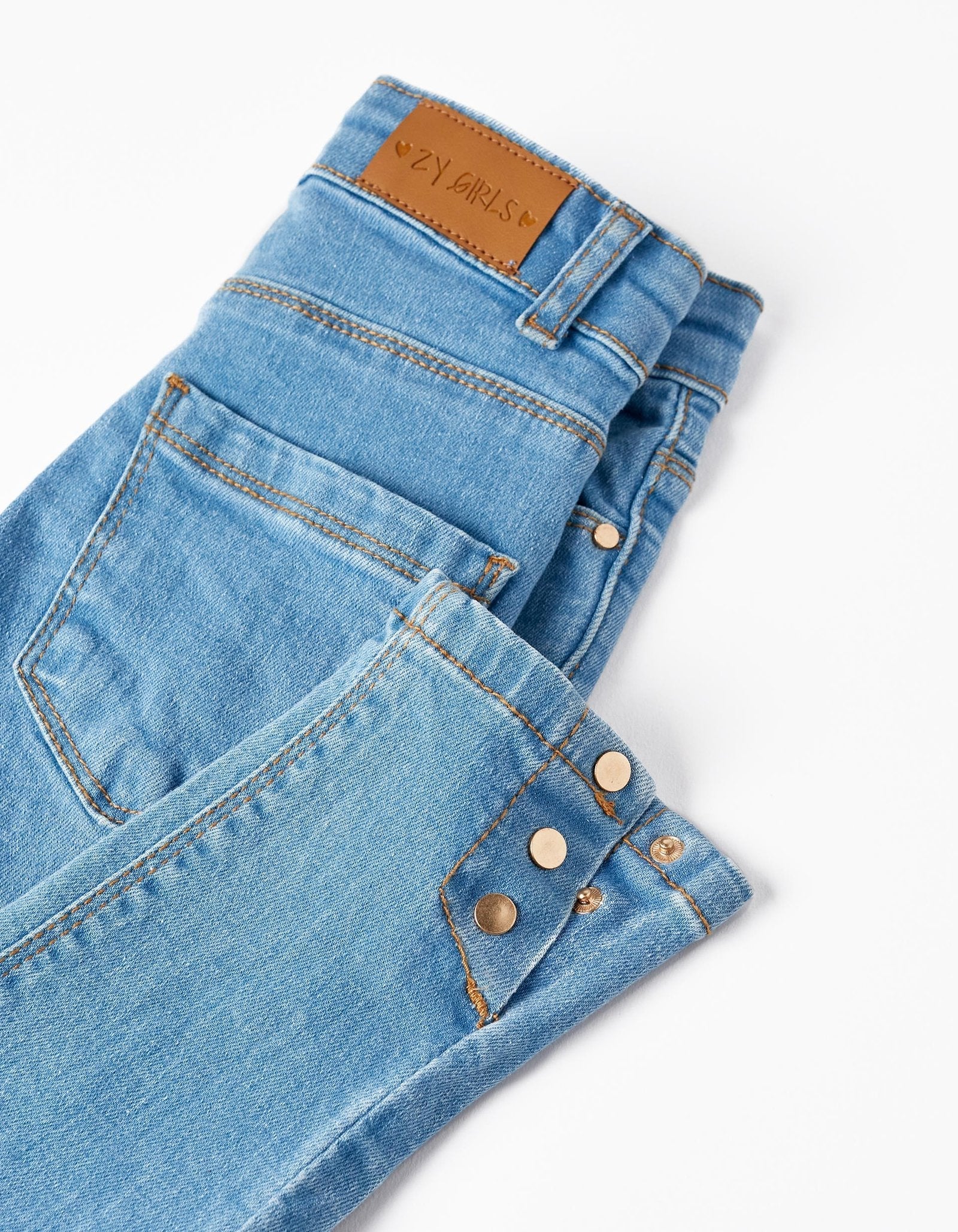 Pantalón vaquero skinny azul claro para niña de denim de algodón. Tejido elástico para mayor confort y libertad de movimientos. Costuras dobles a contraste. Detalle de aberturas laterales con automáticos en la parte inferior. Cintura ajustable en el interior con botones y elásticos. Cierre con automático para vestir fácilmente. Cinco bolsillos. ¡Los vaqueros ajustados perfectos para todos los días! Big Me: se abrocha con broche de presión bajo botón decorativo hasta la talla 8/9, para facilitar el vestir y promover la autonomía de su hija.