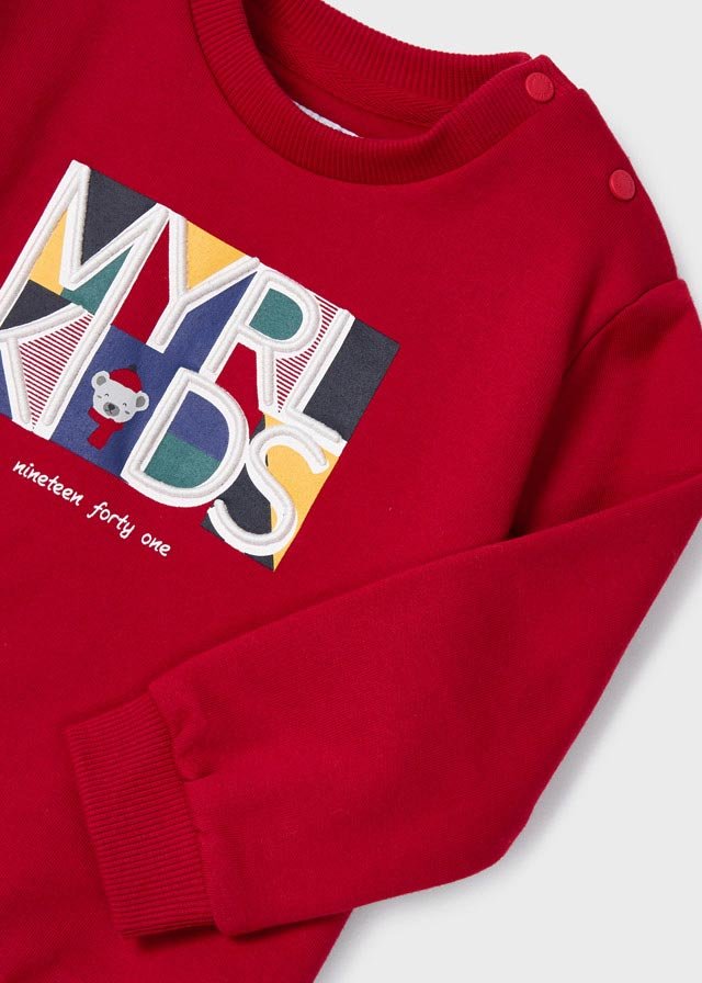 conjunto de dos piezas, pantalón azul y sudadera roja con bordado mayoral en la parte de enfrente