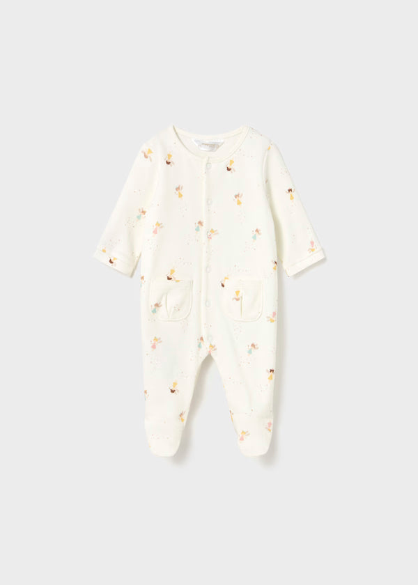 Pelele de manga larga para recién nacida. Cuello bebé. Cierre con botones a presión en la parte posterior. Botones a presión en la entrepierna para facilitar la puesta de la prenda. Elementos de adorno: aplique decorativo, bordado.