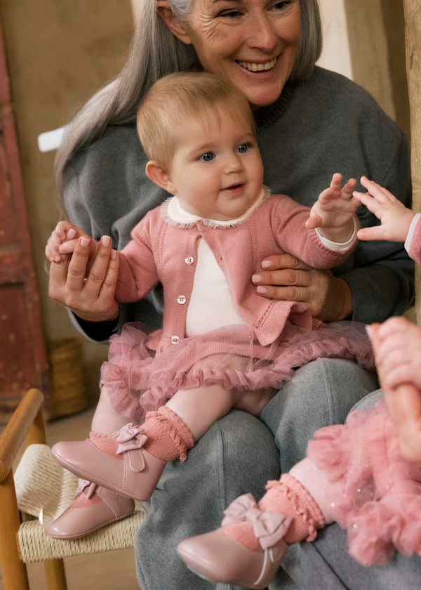 Rebeca de manga larga para recién nacida. Cuello redondo. Cierre con botones en la parte delantera. Diseño con volante en el bajo de la prenda.