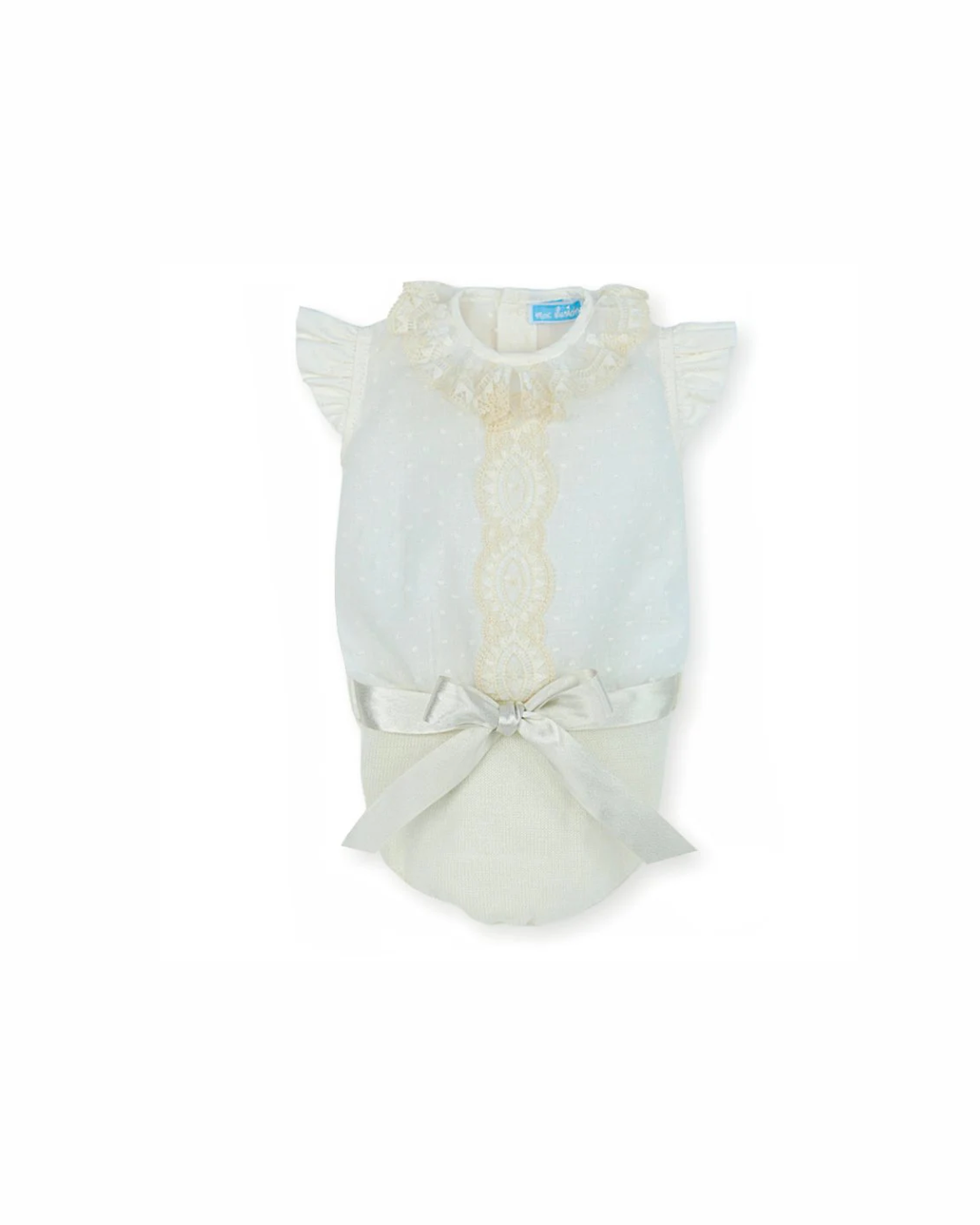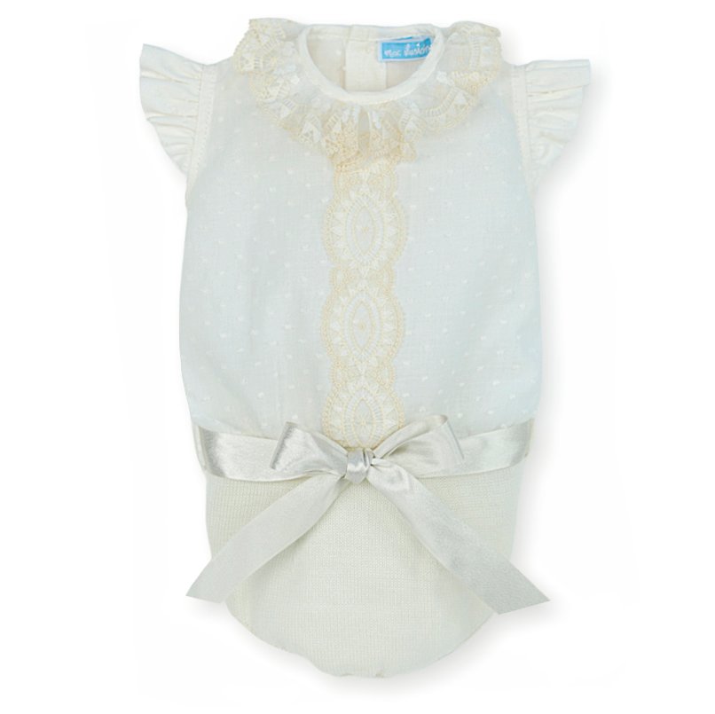 pelele corto crudo talle punto encaje y tejido abajo, con cinto de listón.