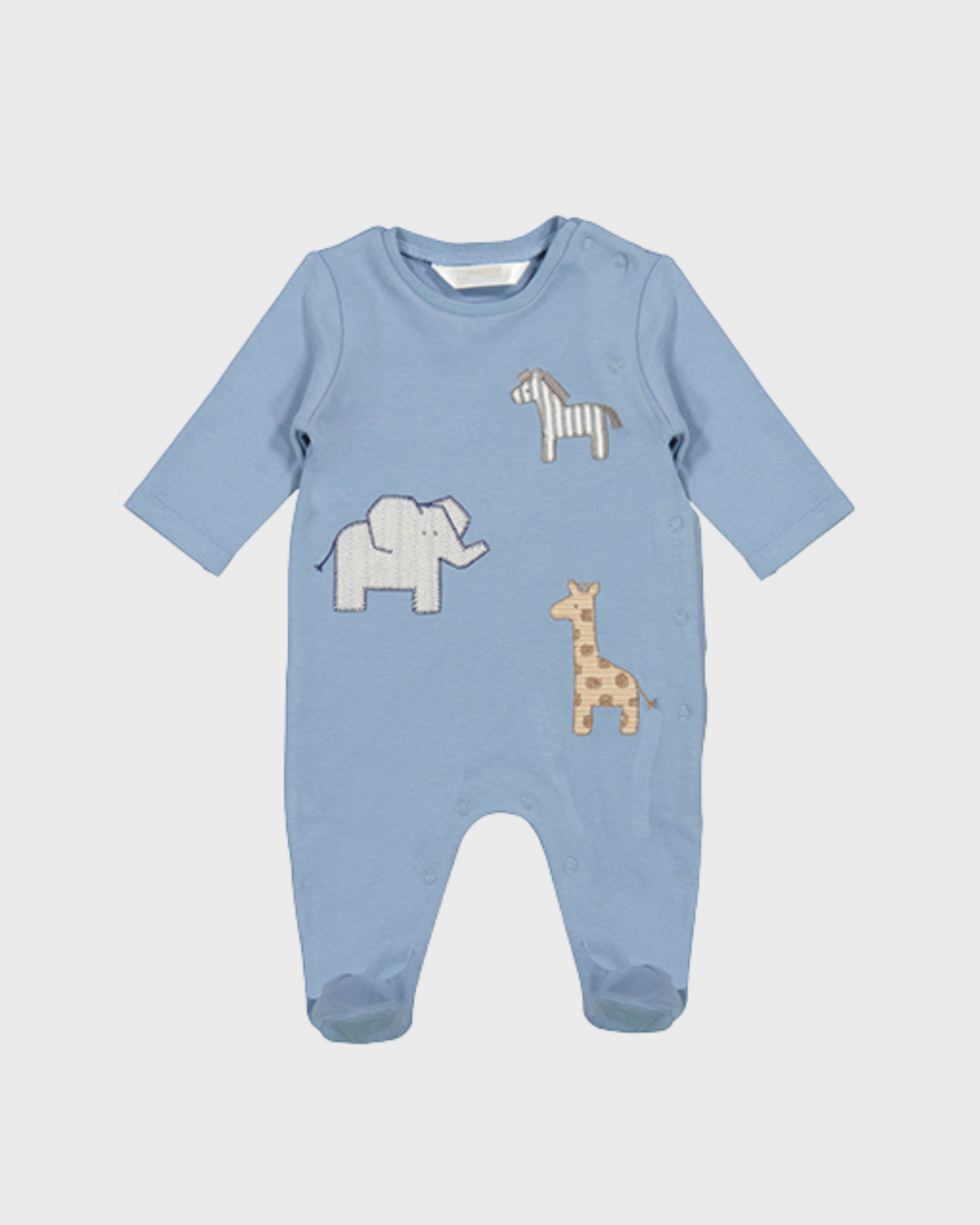 Pelele de manga larga para recién nacido. Cuello redondo. Cierre con botones a presión en la parte delantera. Botones a presión en la entrepierna para facilitar la puesta de la prenda. Diseño estampado. En este modelo las tallas mayores (de 6-9 a 18 meses) no llevan pies, para facilitar una mejor movilidad del bebé y mayor confort en el uso.