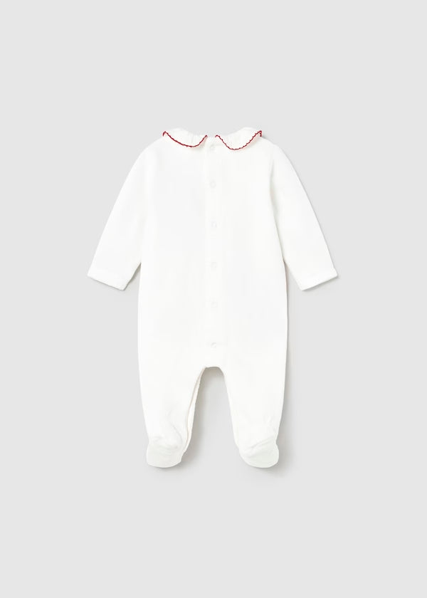 Pelele de manga larga para recién nacida. Cuello bebé. Cierre con botones a presión en la parte posterior. Botones a presión en la entrepierna para facilitar la puesta de la prenda. Elementos de adorno: aplique decorativo, bordado.