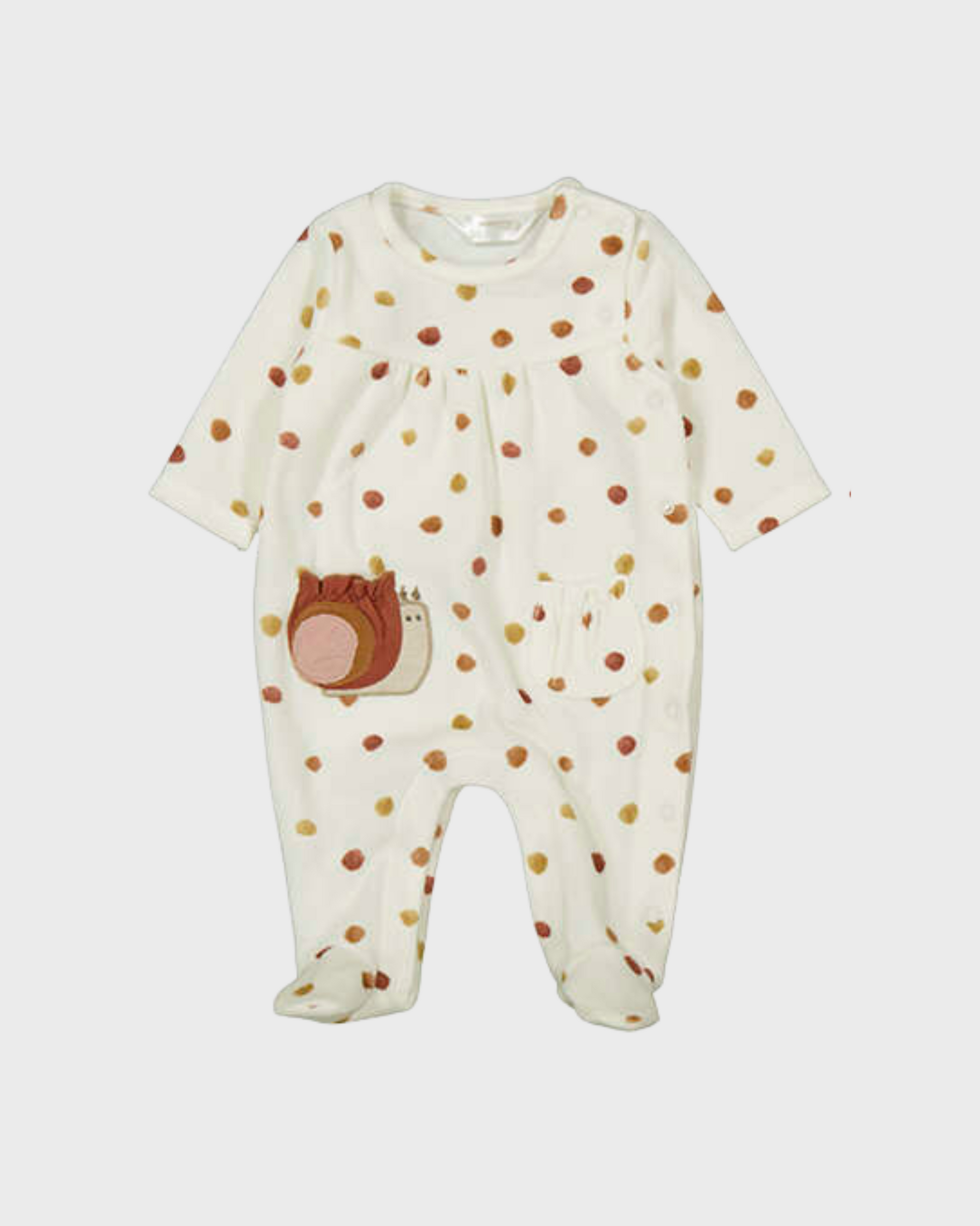 Pelele de manga larga para recién nacida. Cuello bebé. Cierre con botones a presión en la parte posterior. Botones a presión en la entrepierna para facilitar la puesta de la prenda. Elementos de adorno: aplique decorativo, bordado.