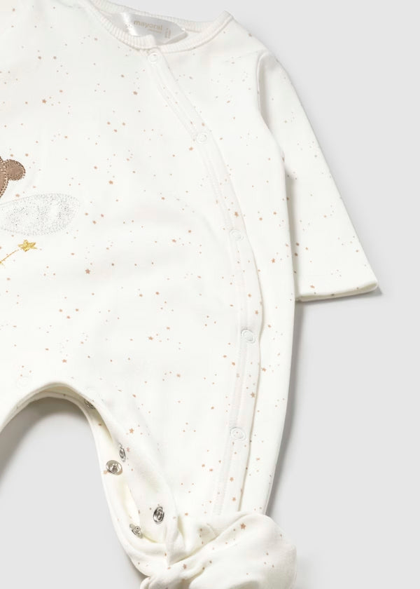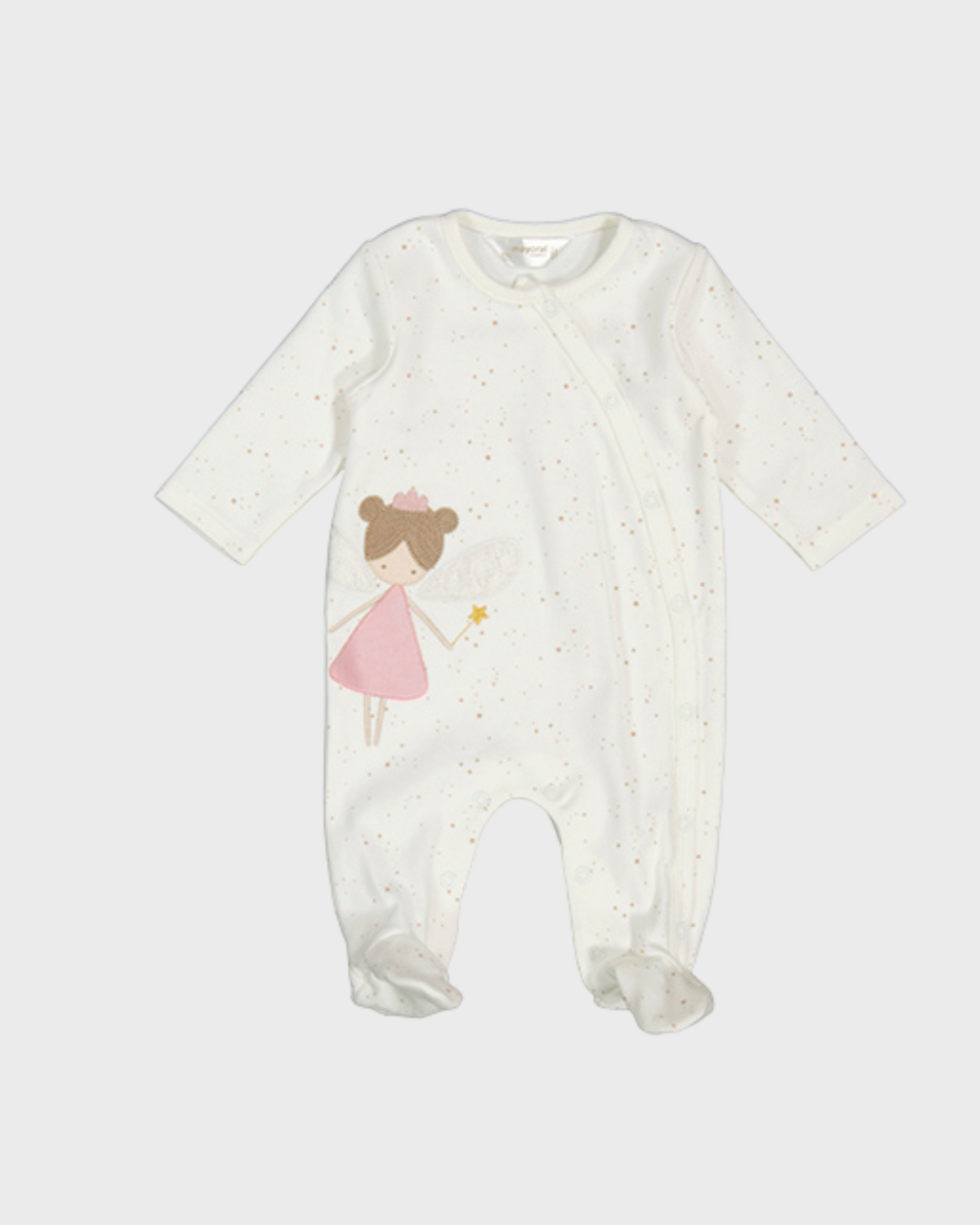 Pelele de manga larga para recién nacida. Cuello bebé. Cierre con botones a presión en la parte posterior. Botones a presión en la entrepierna para facilitar la puesta de la prenda. Elementos de adorno: aplique decorativo, bordado.