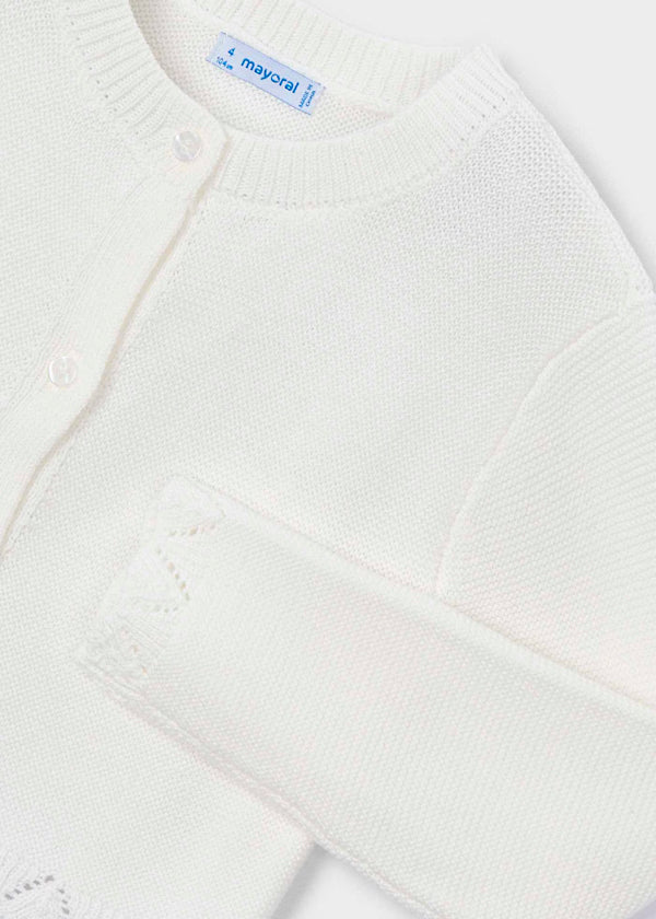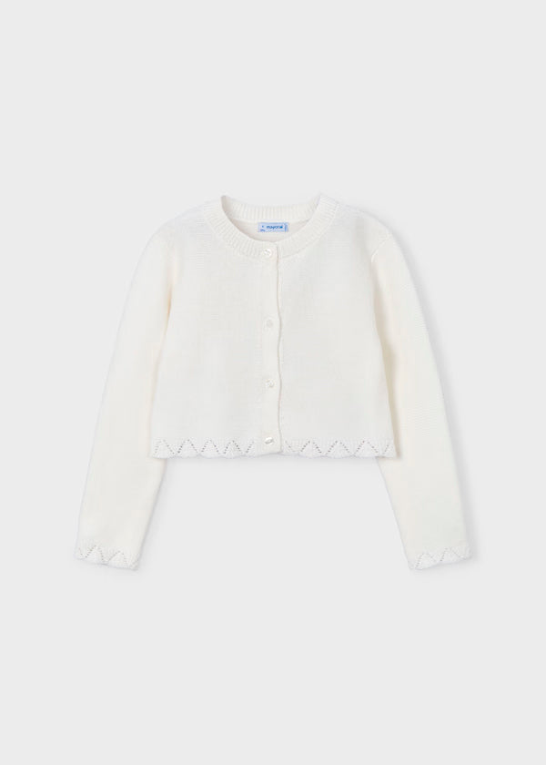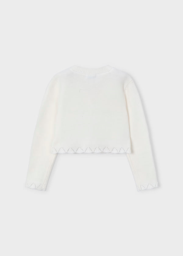 Rebeca de manga larga para niña. Cierre con botones en la parte delantera. Diseño con terminaciones en ondas.