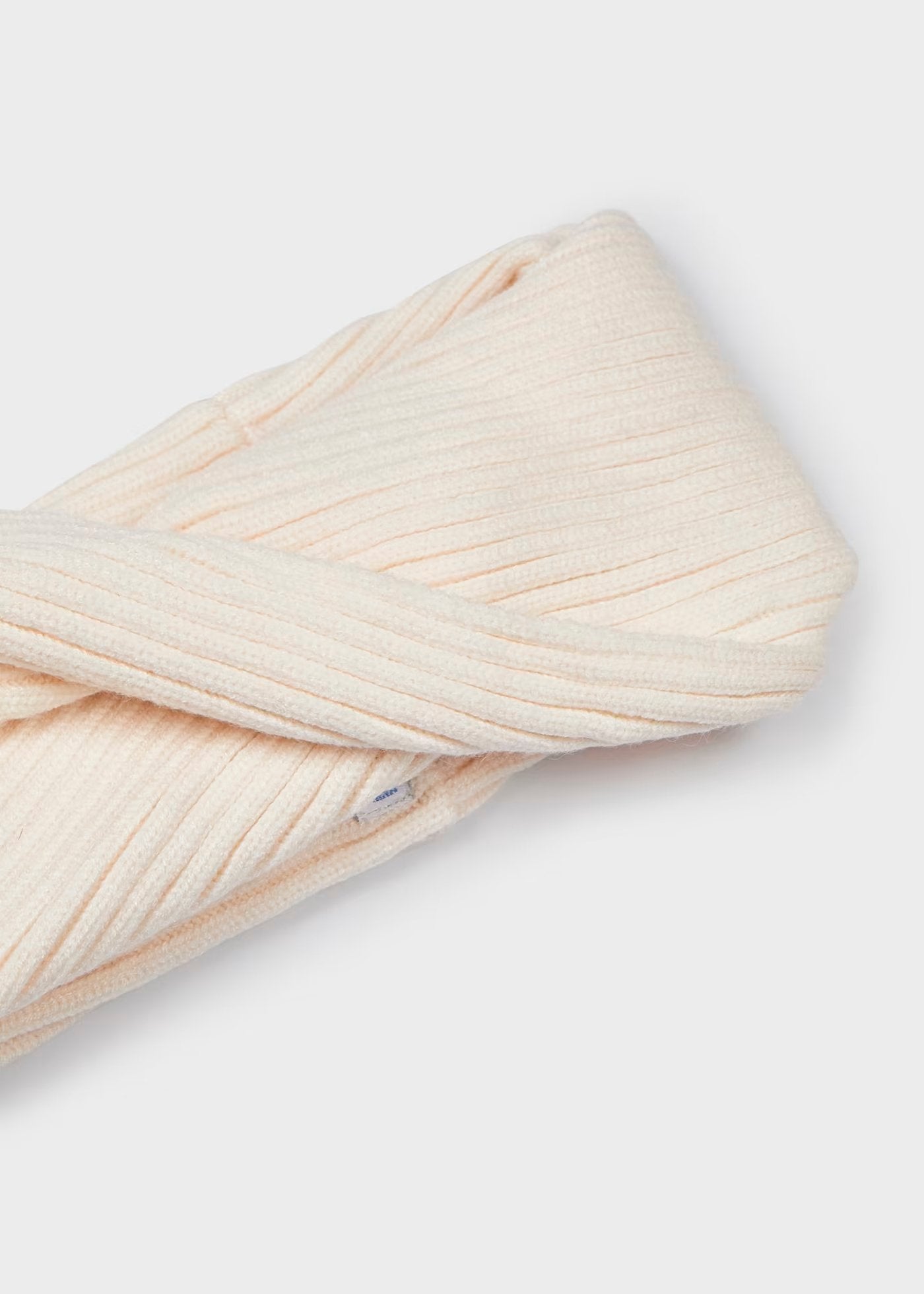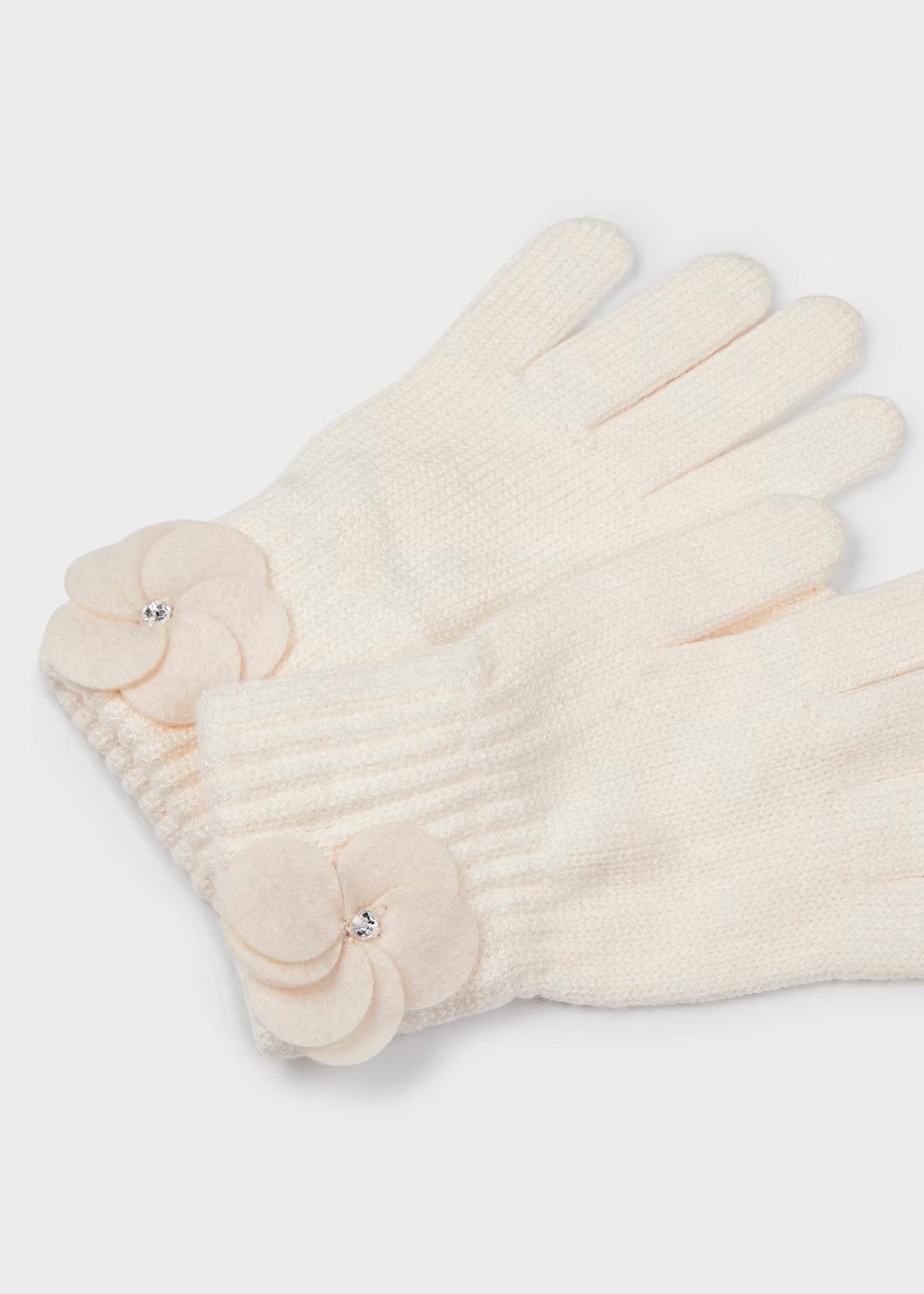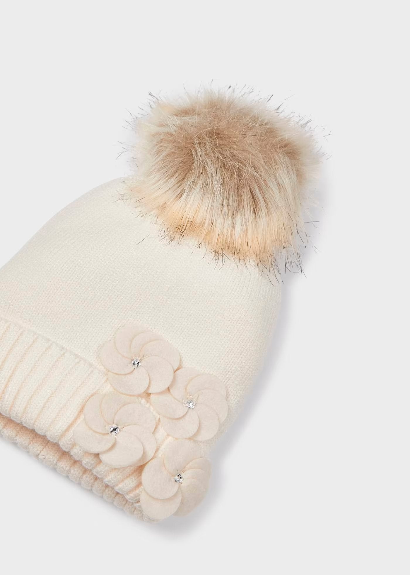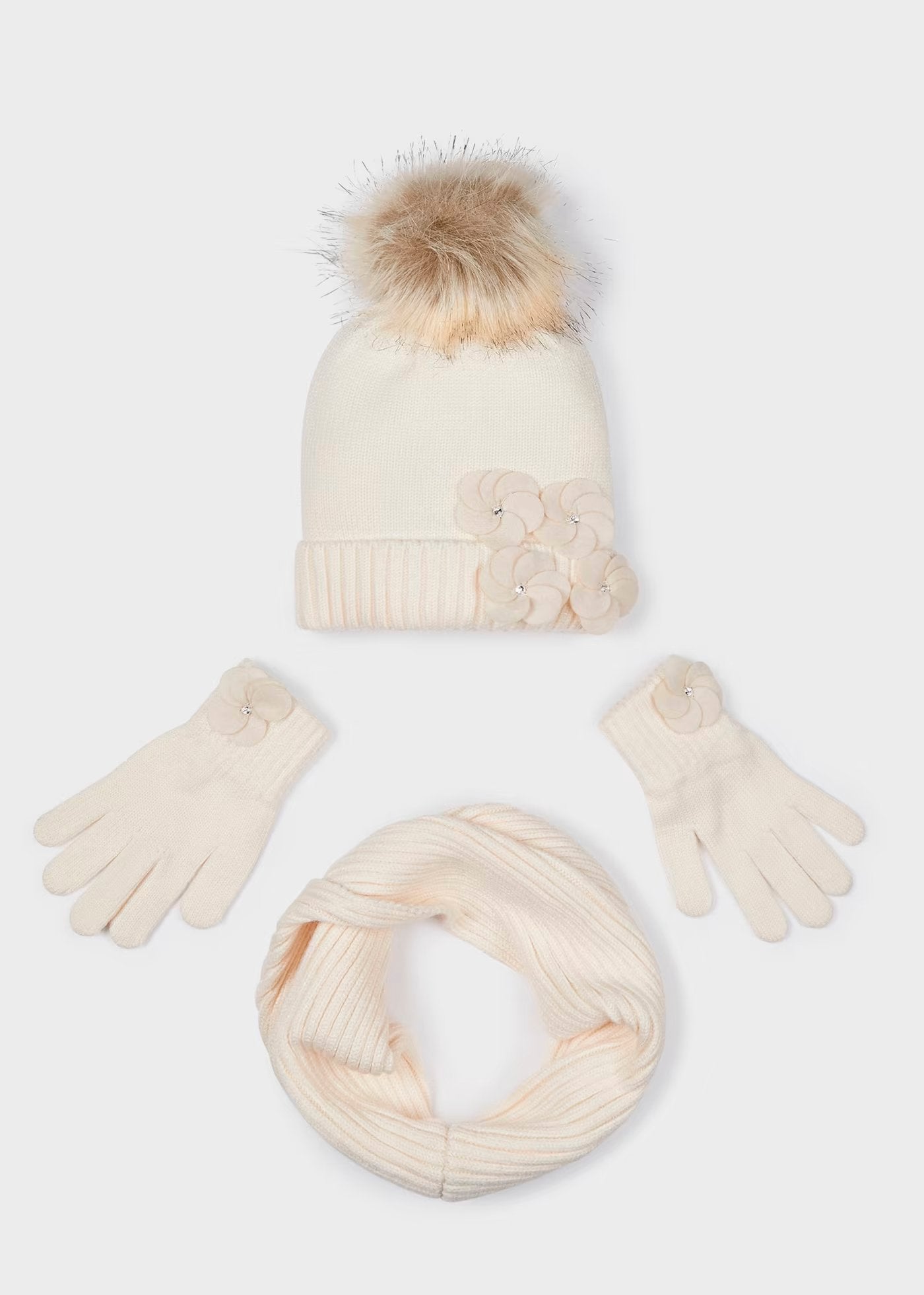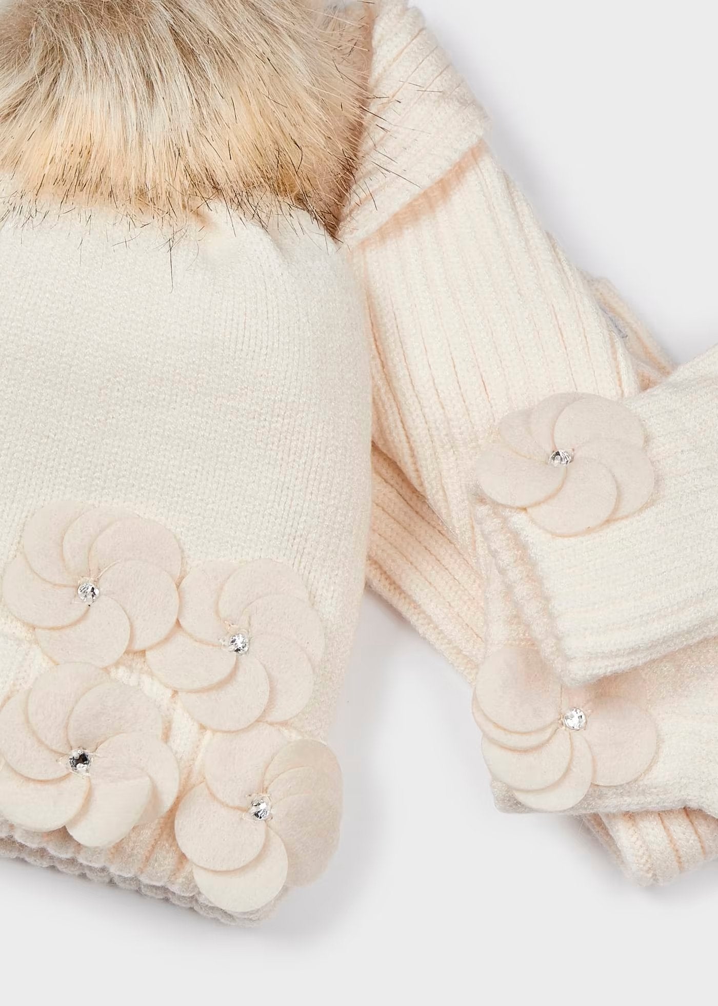 set 3 piezas tricot niña, incluye gorro guantes y bufanda, color garbanzo con aplicaciones flor