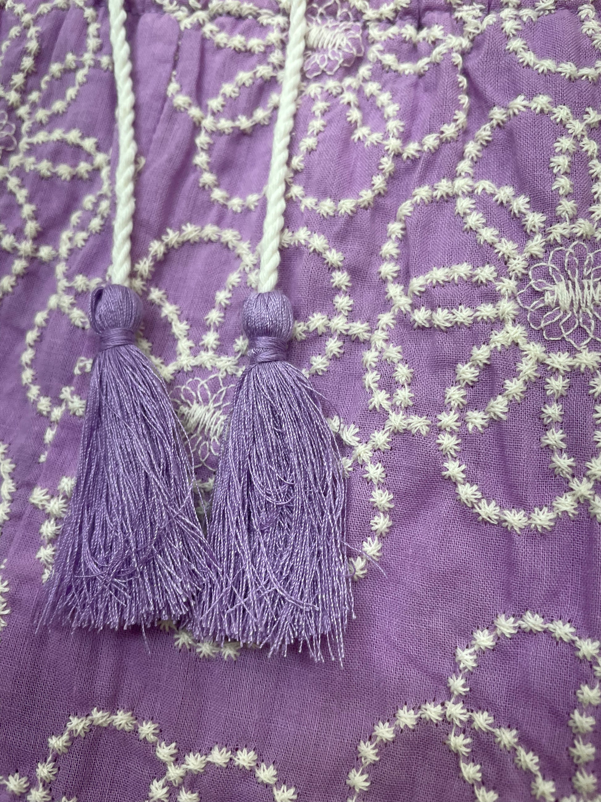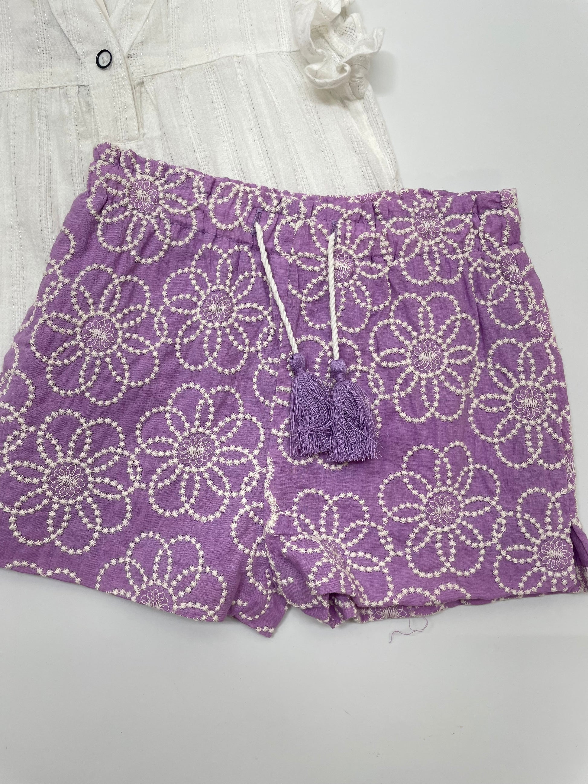 ¡Viste a tu niña con estilo y comodidad! Este adorable set incluye una blusa blanca con hilos de plata y un short de tela con flores lilas y jareta decorativa. Perfecto para una tarde divertida o una fiesta especial. ¡Haz que tu niña se sienta hermosa y lista para cualquier ocasión con este conjunto!