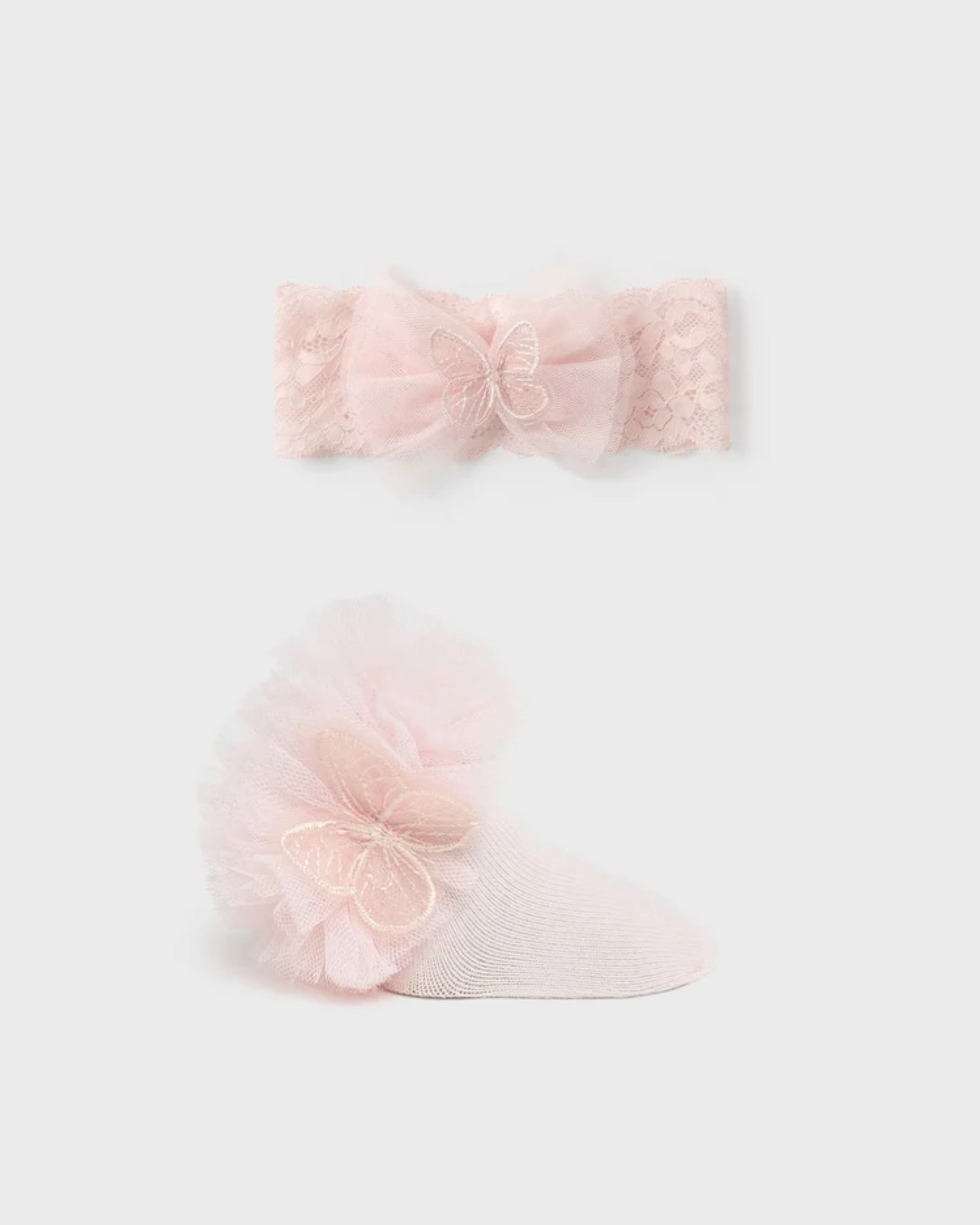 Este conjunto incluye calcetines y una diadema decorada con un aplique, ideal para complementar cualquier atuendo con un toque delicado y encantador.