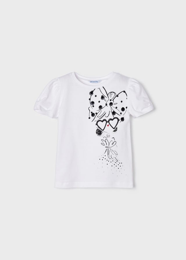 Playera de manga corta para niña. Cuello redondo. Suave tejido de algodón elástico. Diseño estampado.