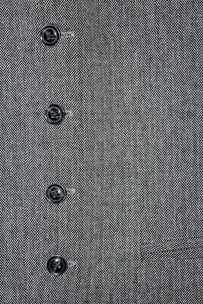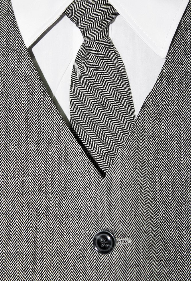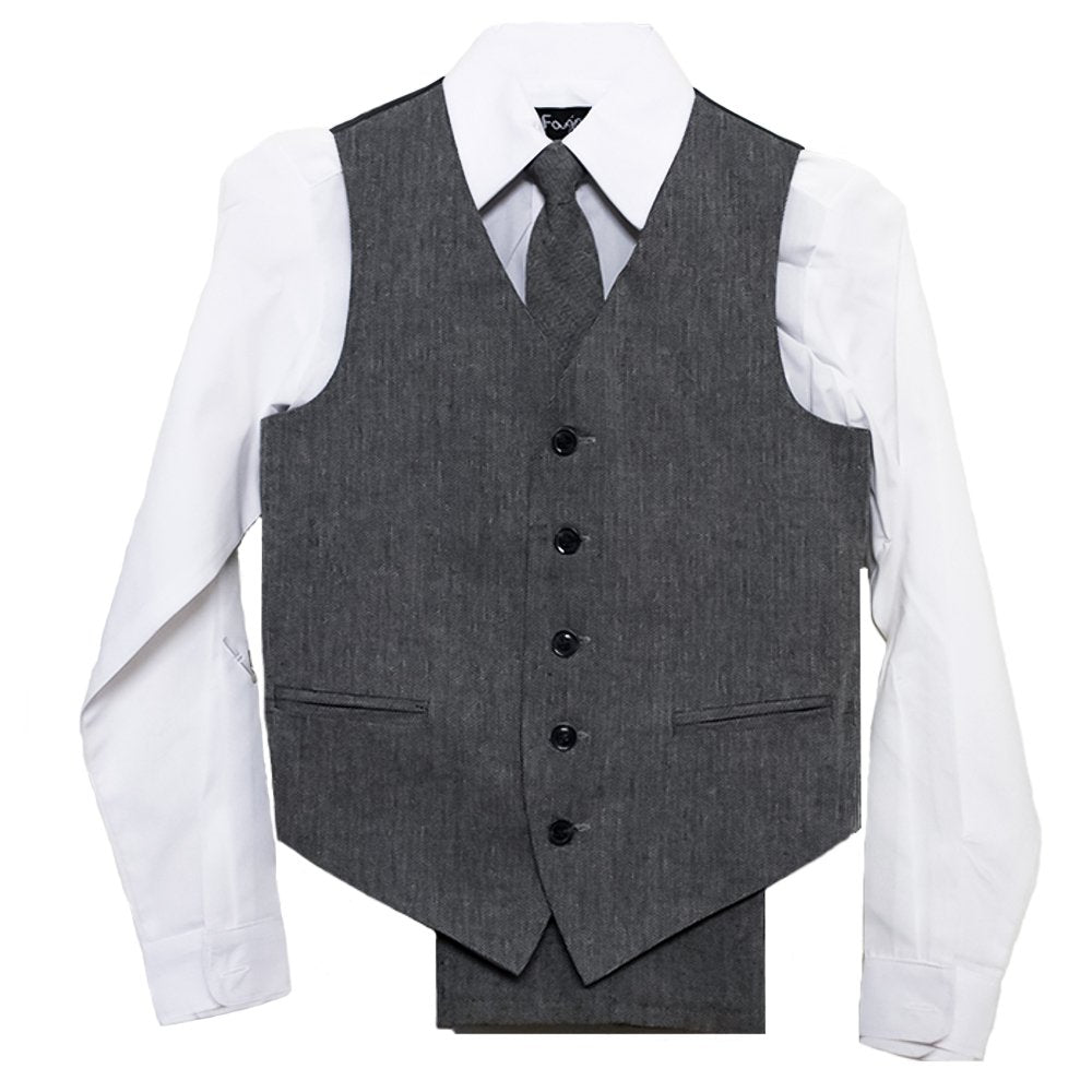Traje gris a rayas negras y blancas de vestir con corbata y chaleco del mismo diseño.  Chaleco parte delantera con cierre de botones y para su mayor ajuste en la parte trasera con elástico. Camisa blanca elegante que combina a la par con el conjunto. Pantalón a la medida.