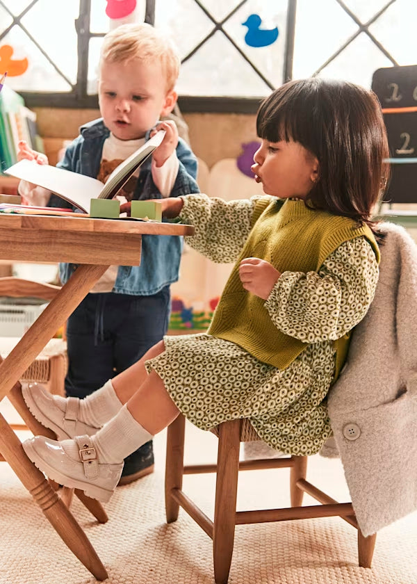 Vestido de manga larga para bebé. Pequeña abertura en la espalda con cierre de botón para facilitar la puesta de la prenda. Confección combinada en distintos tejidos para conseguir un diseño único y especial. Modelo con rizo. Diseño estampado.
