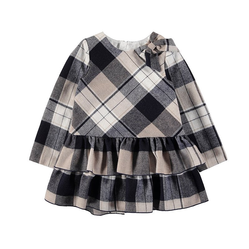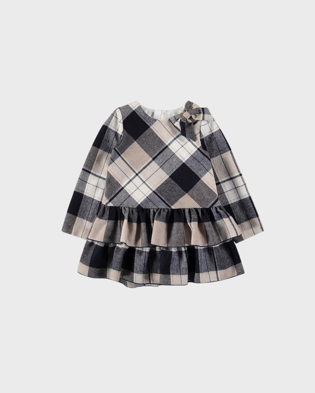 Vestido maxi diseño a cuadro color azul marino, negro, crema. Moño en esquina como parte de su decoración.
