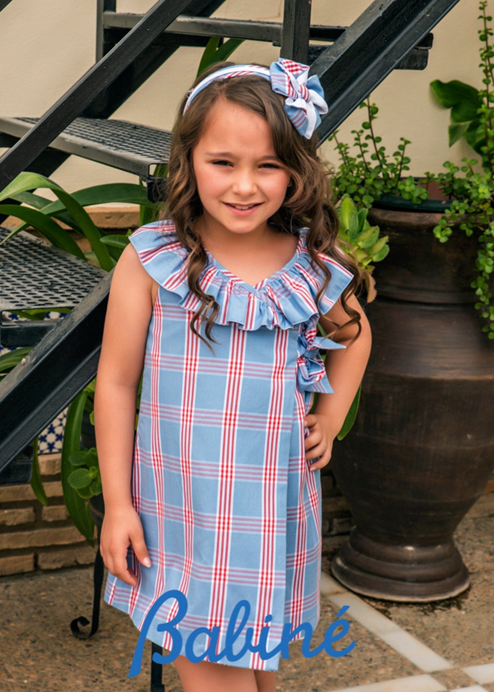 vestido a cuadros con olan en el cuello, y cierre con moño en el lado izquierdo. marca babiné