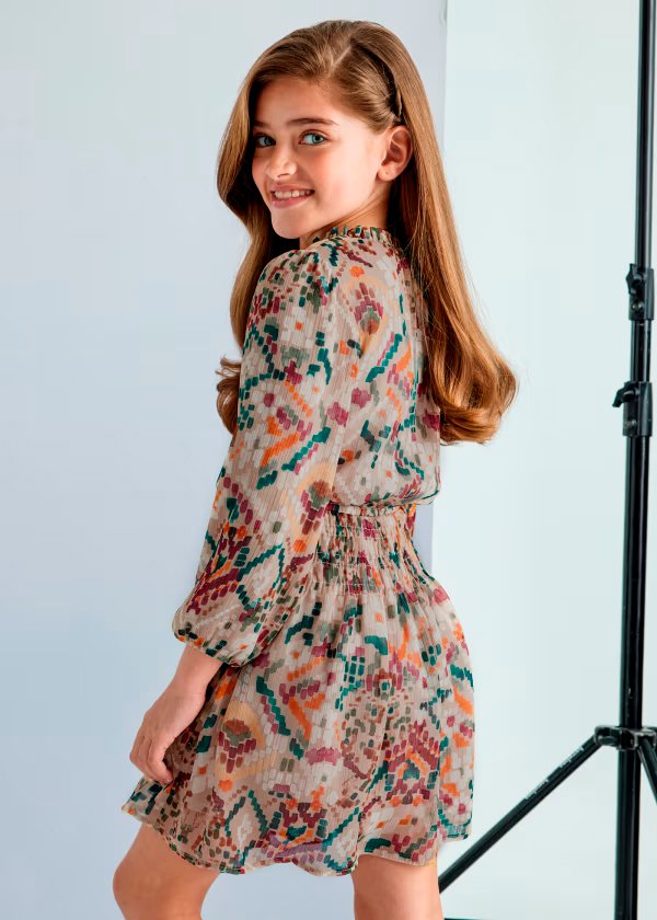 ¡Inspirado en la naturaleza! Este vestido para niña cuenta con hermosos patrones sepia y detalles de humo en la cintura. ¡Hace que tu pequeña se vea elegante y a la moda mientras se divierte en cualquier ocasión!