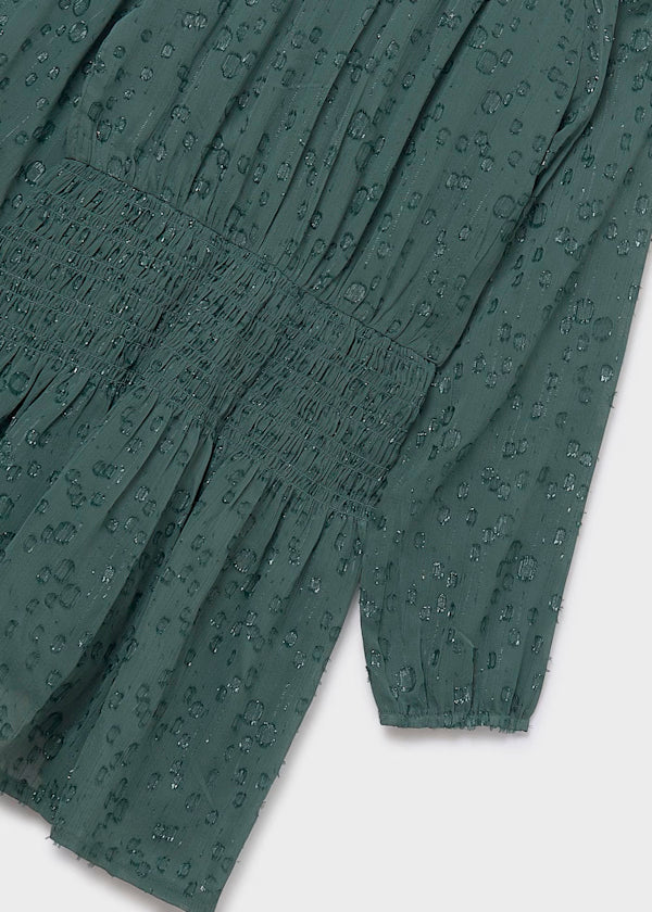 Vestido de manga larga para chica. Modelo con cuello mao al tono. Fluido tejido de gasa de gran ligereza. Este modelo lleva detalles de nido de abeja.