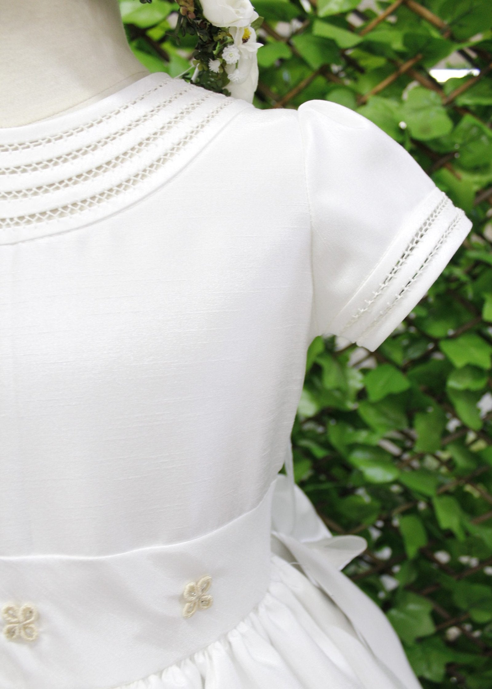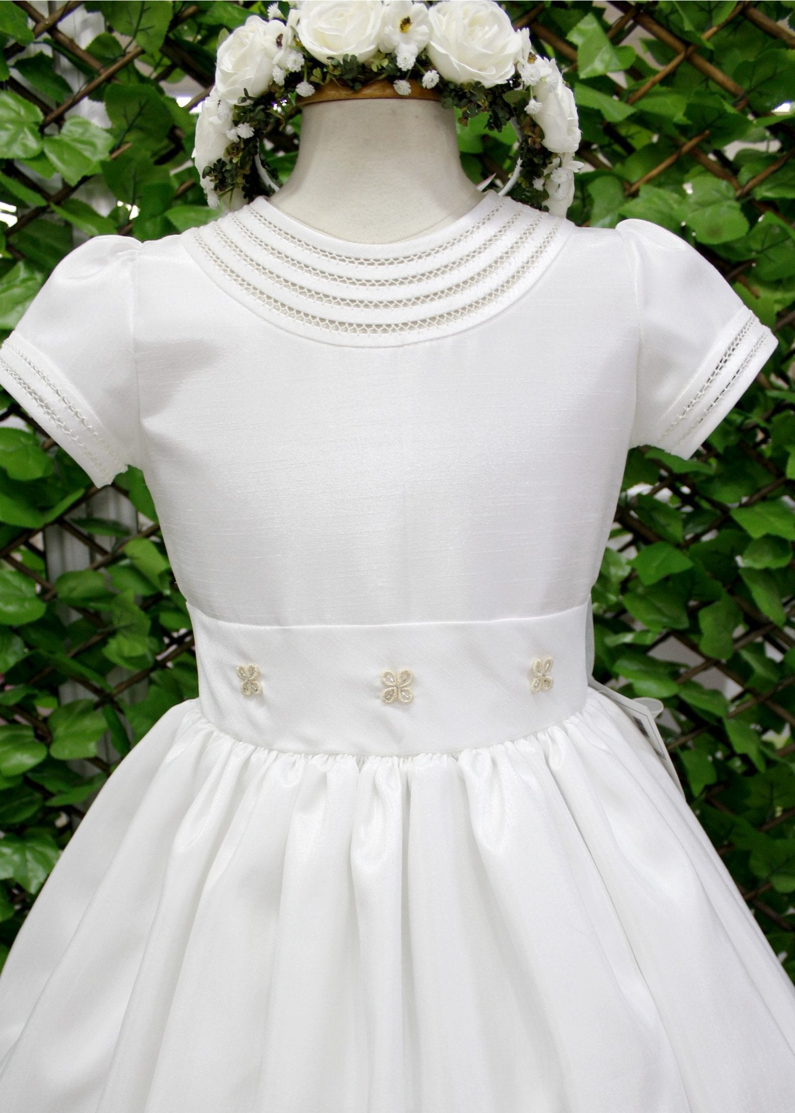 vestido primera comunión, 3 flores en cintura, detalles bordados en cintura y falda