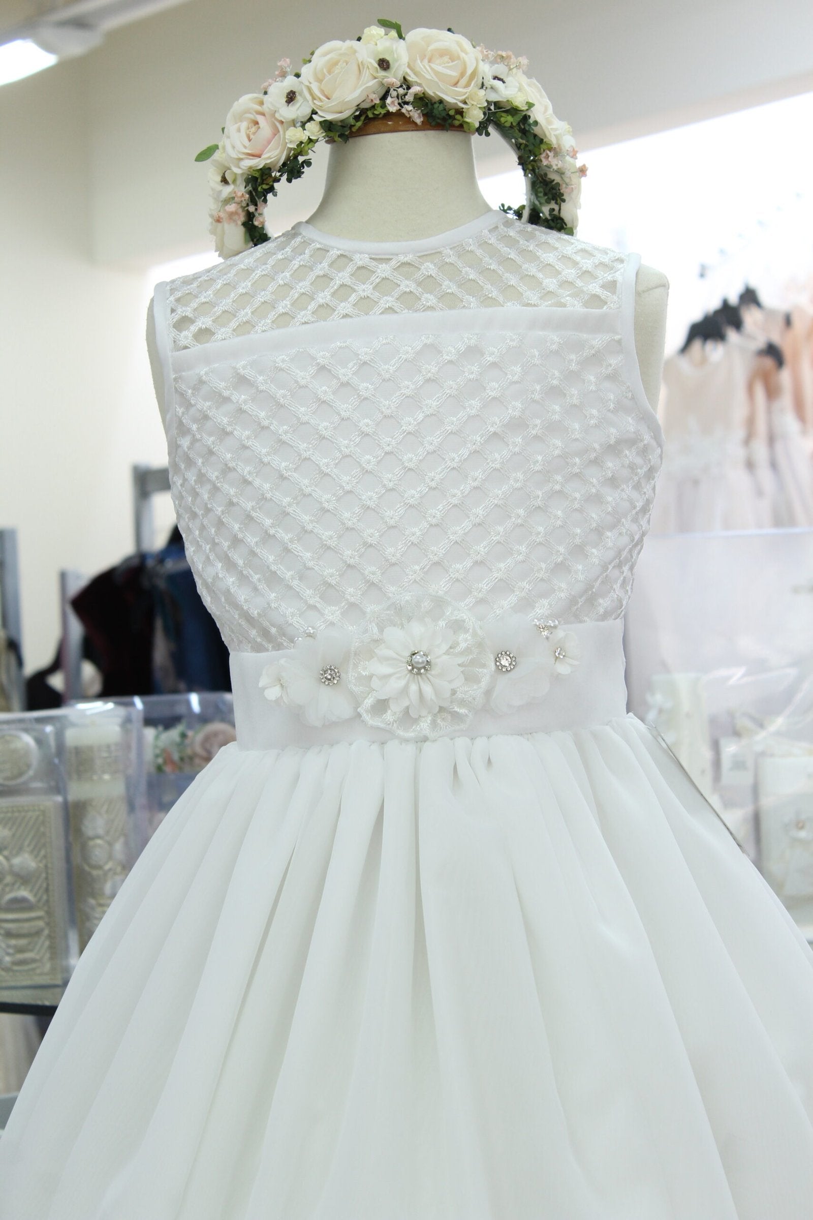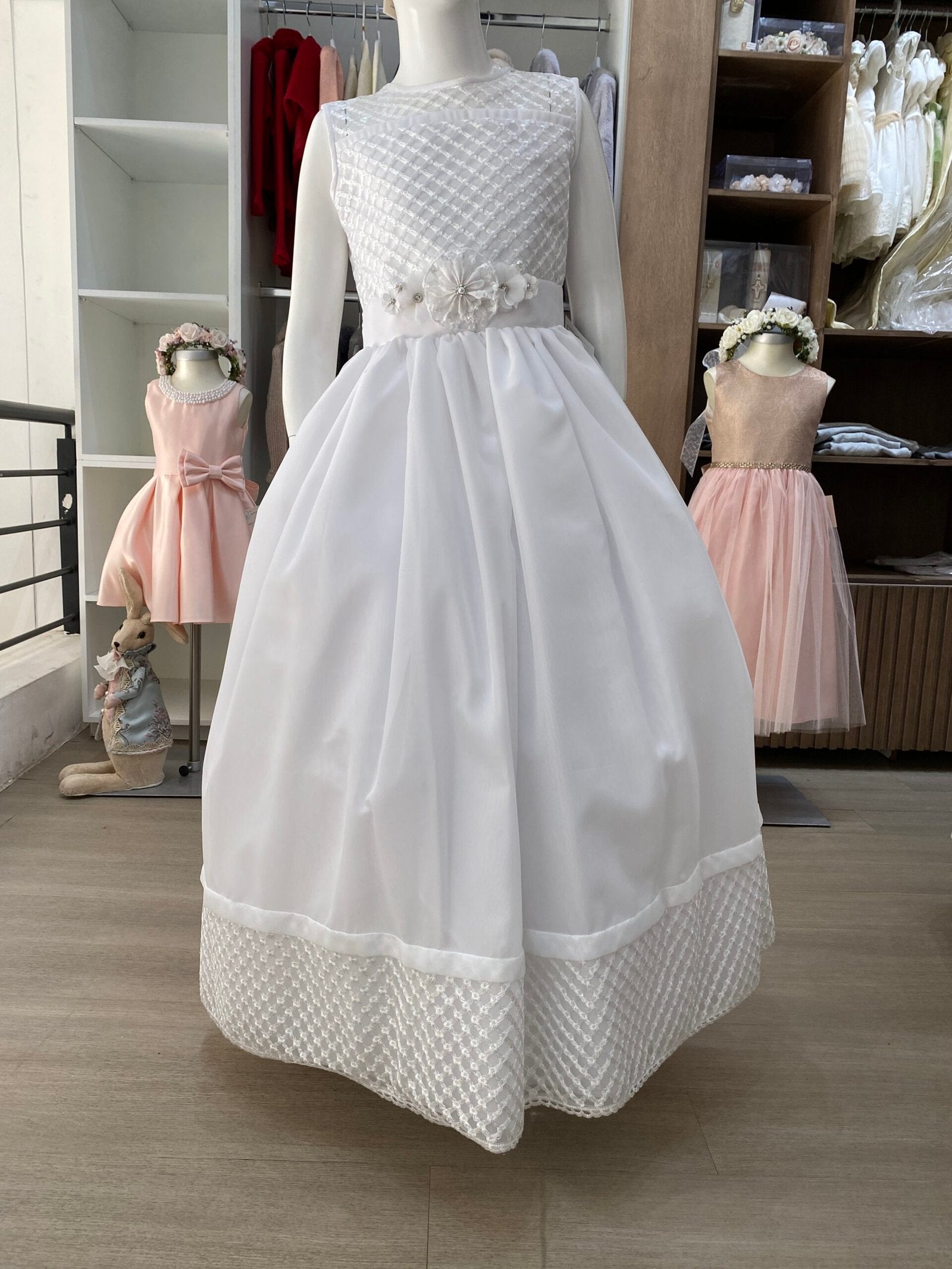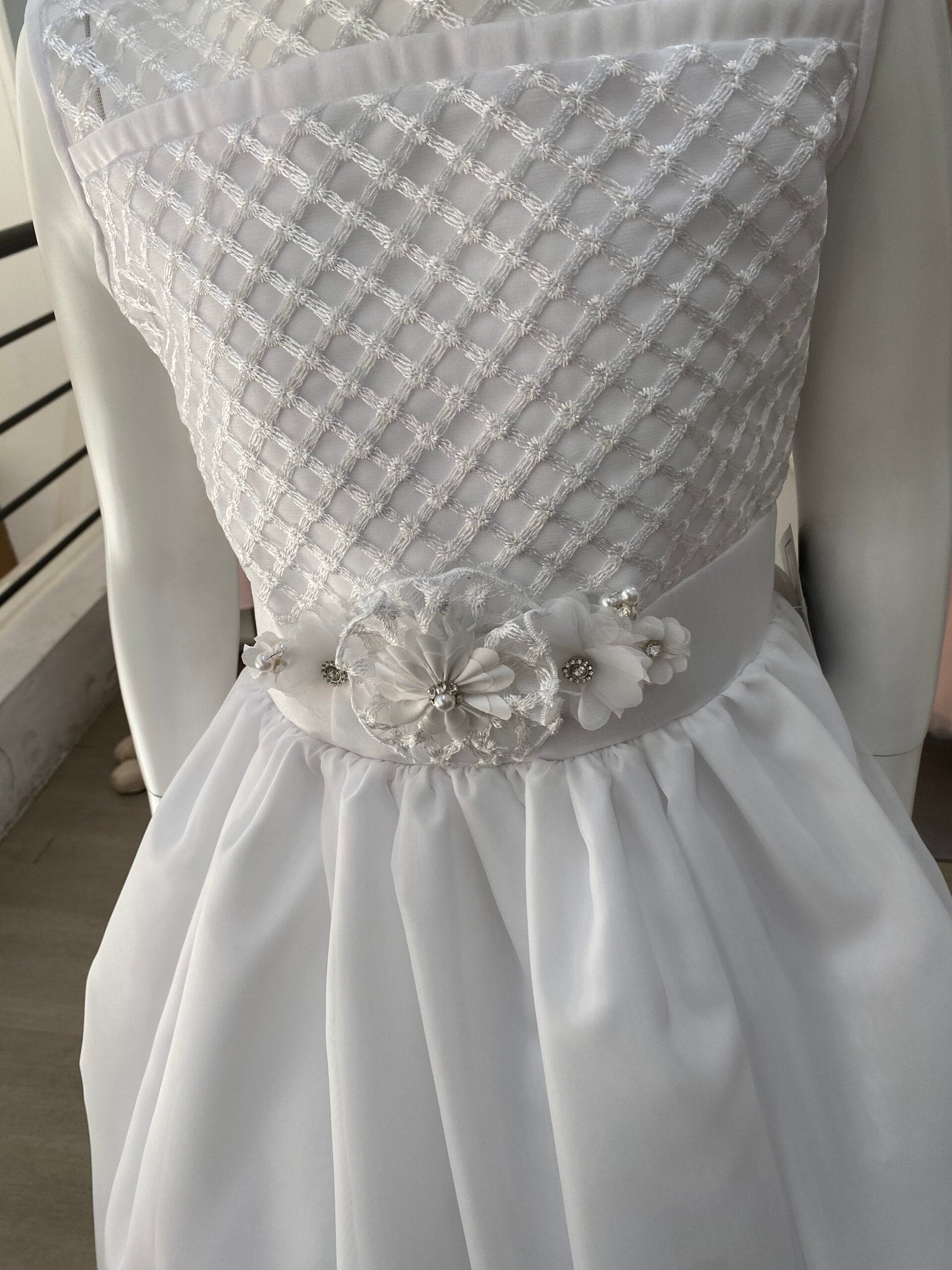 vestido primera comunión color blanco, sin manga manga, broche prendedor con flores en cintura.