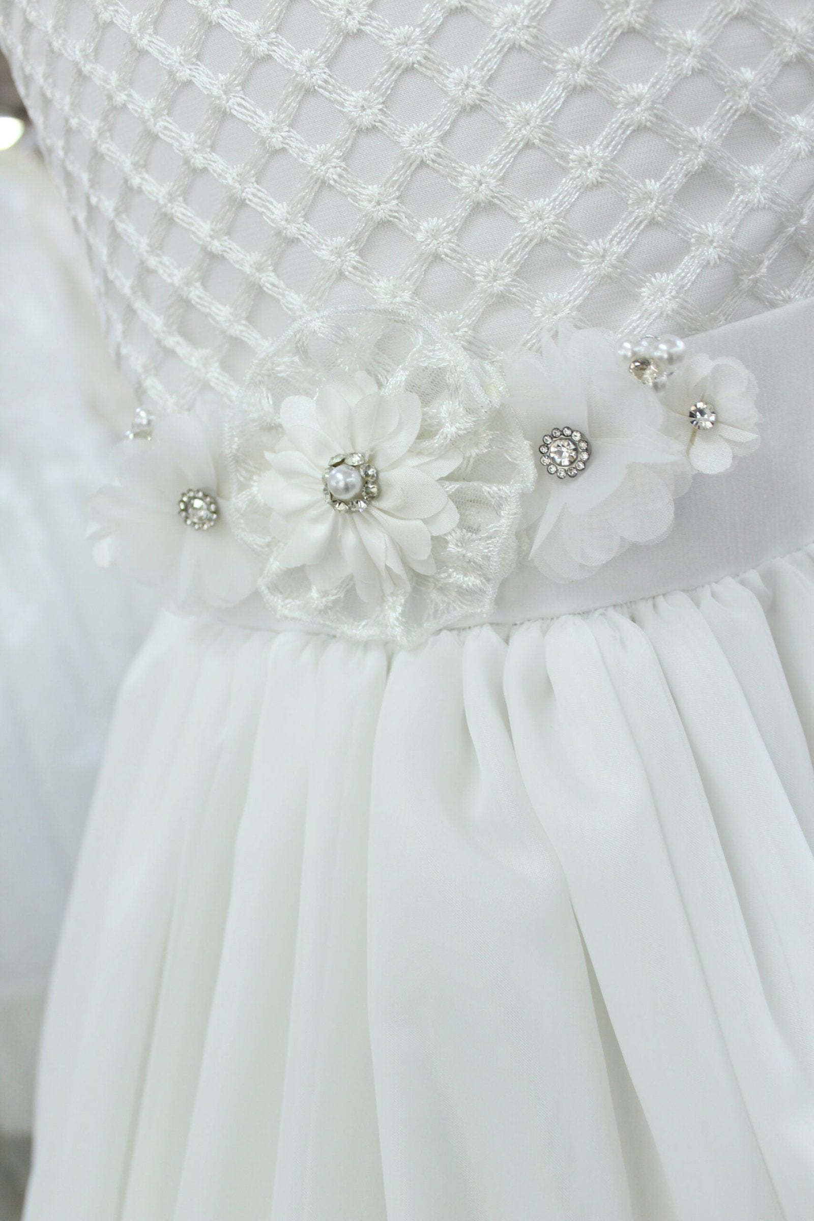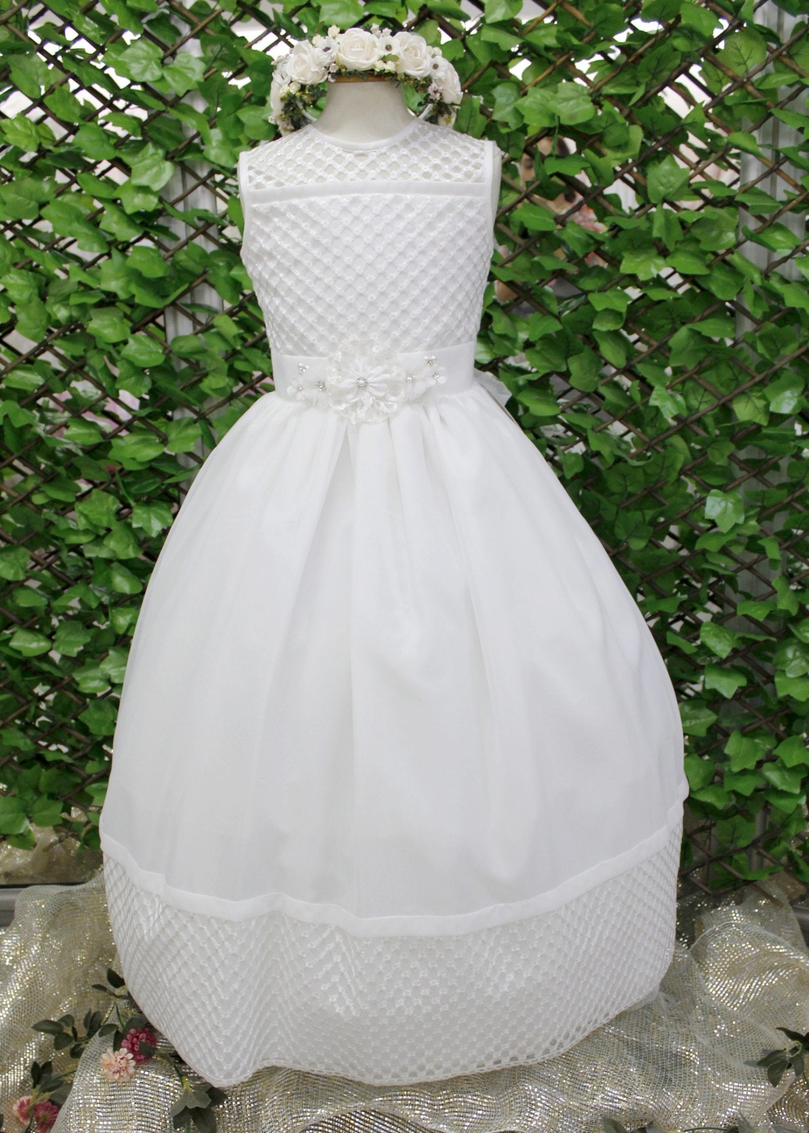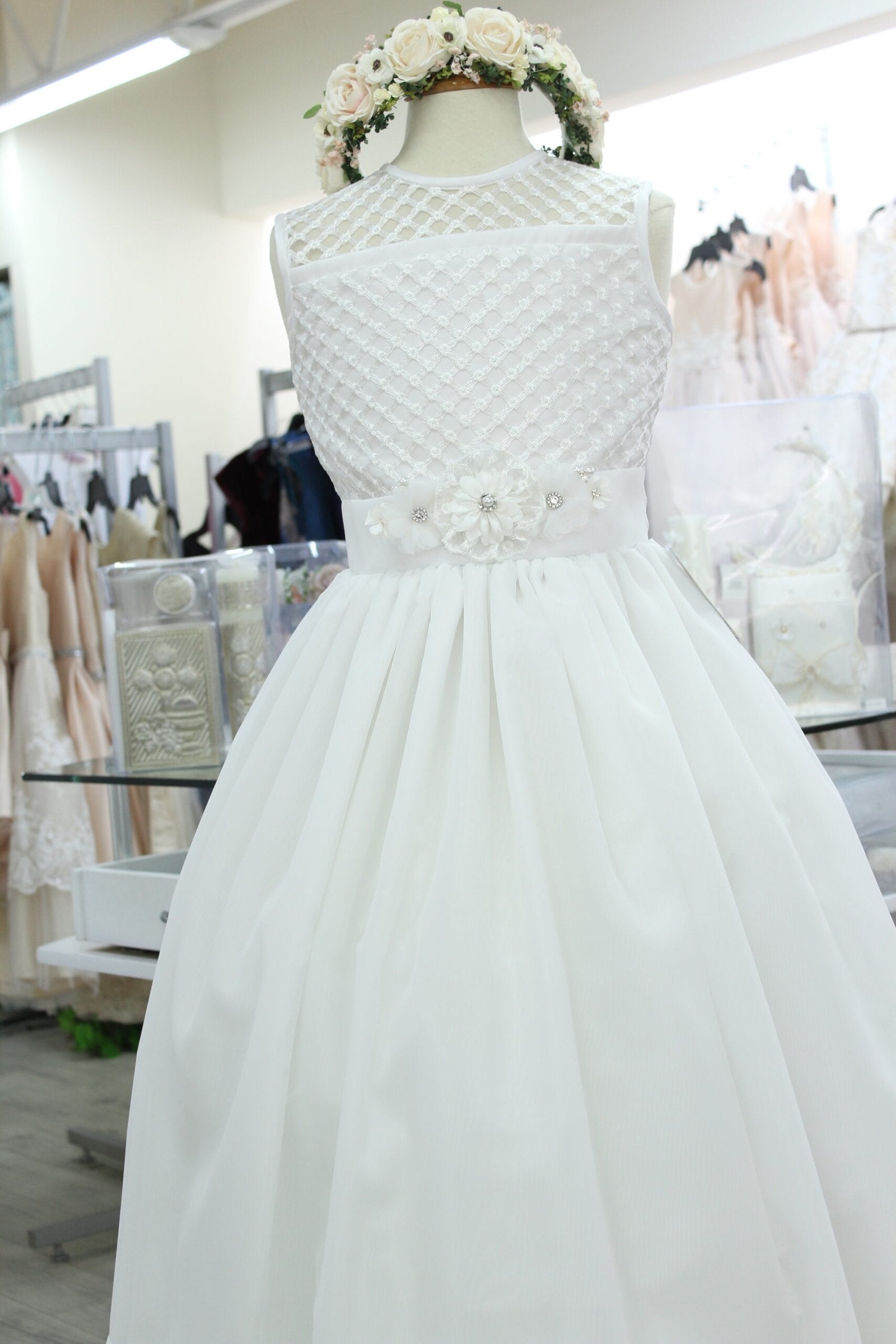 vestido primera comunión color blanco, sin manga manga, broche prendedor con flores en cintura.