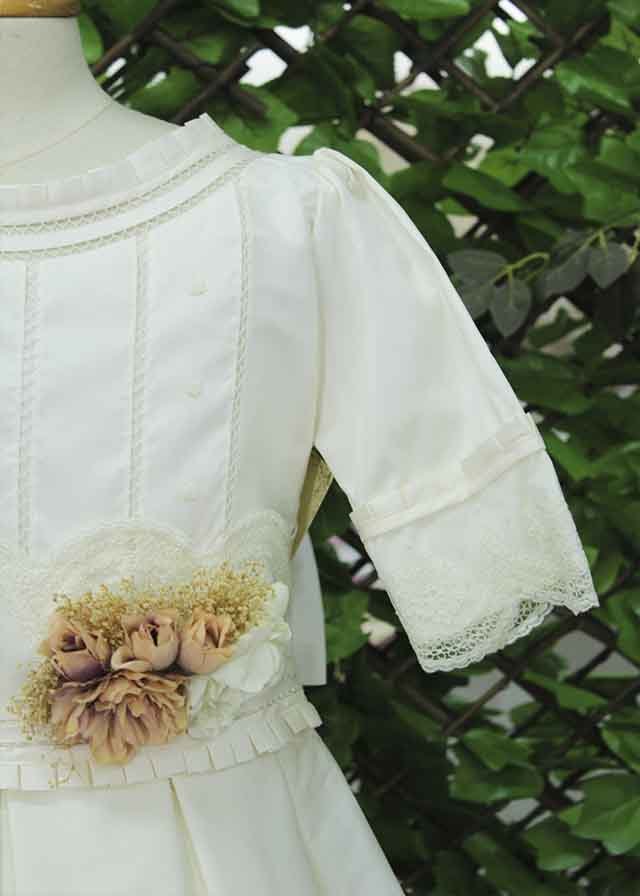 vestido ivory primera comunión, peto 6 bolitas, cinto con encaje, manga 3/4, flores en la cintura