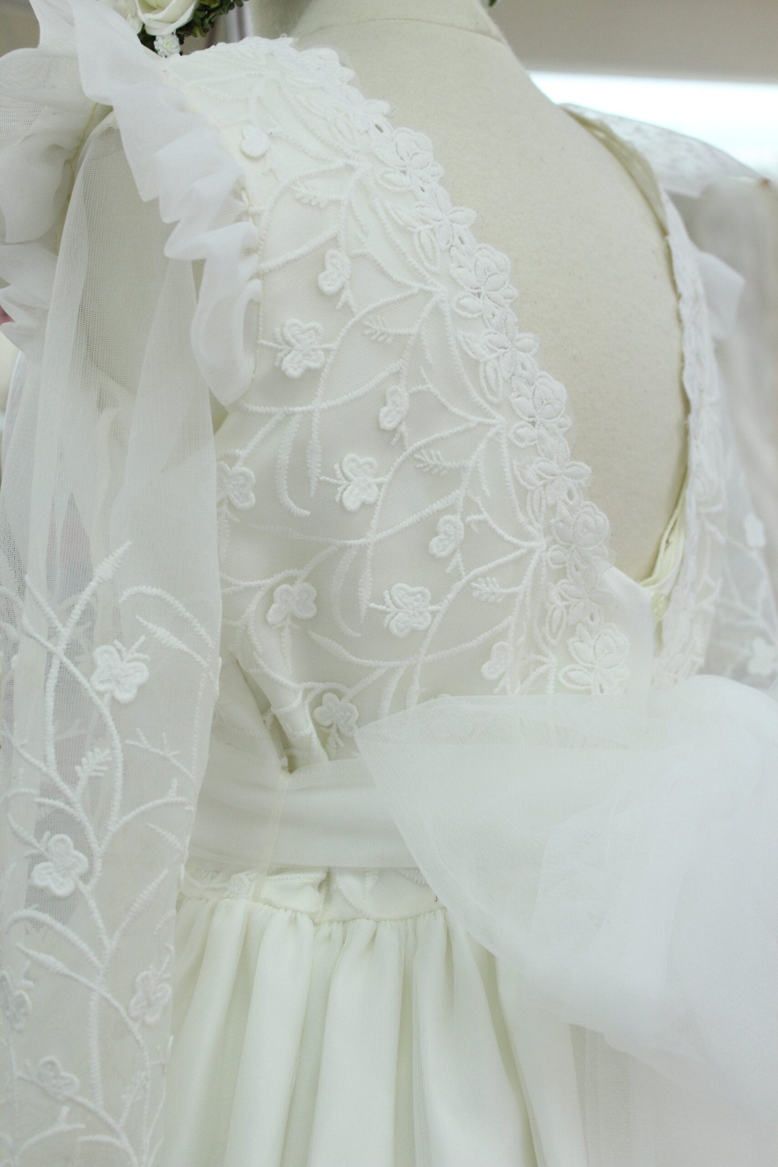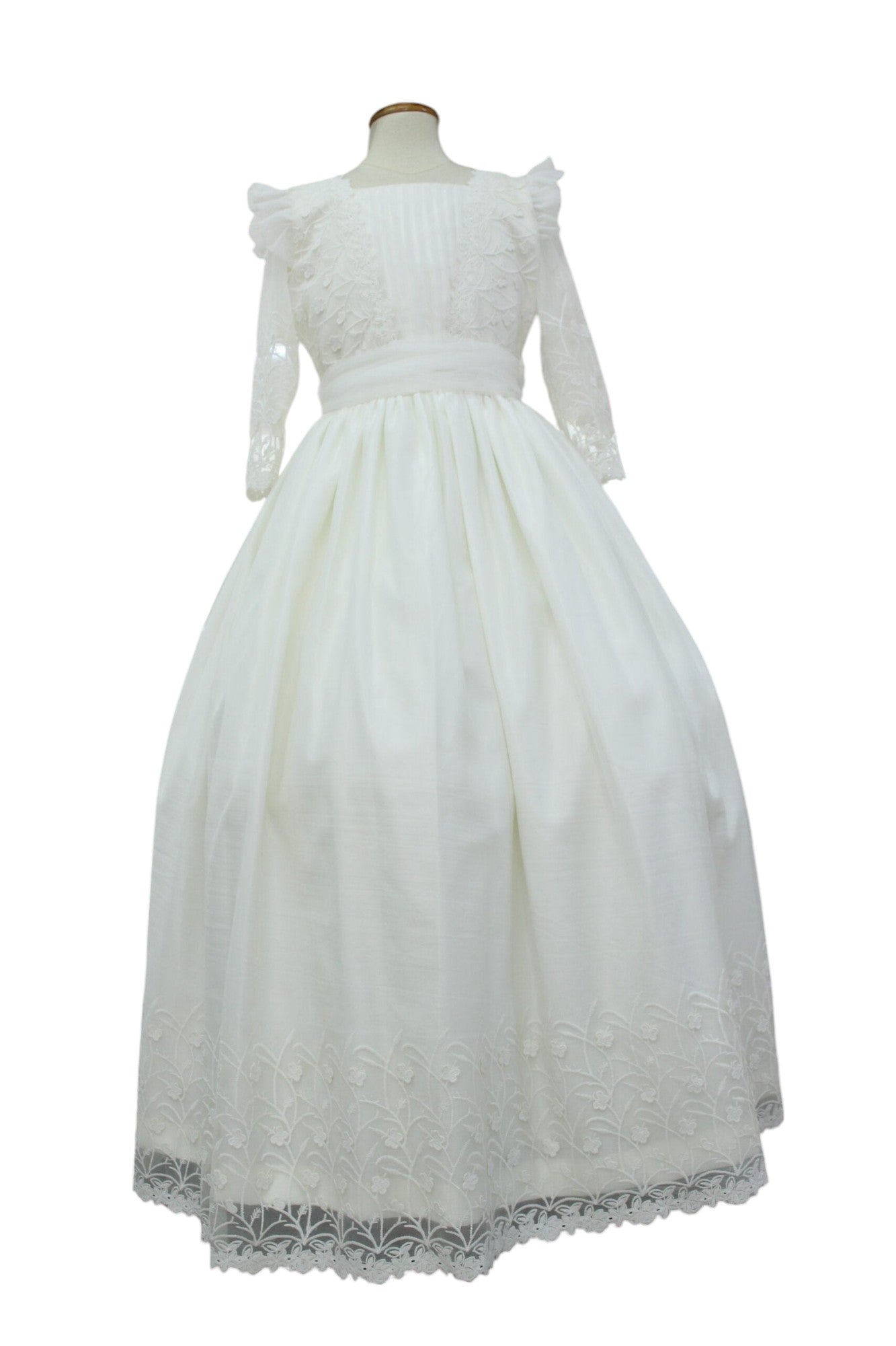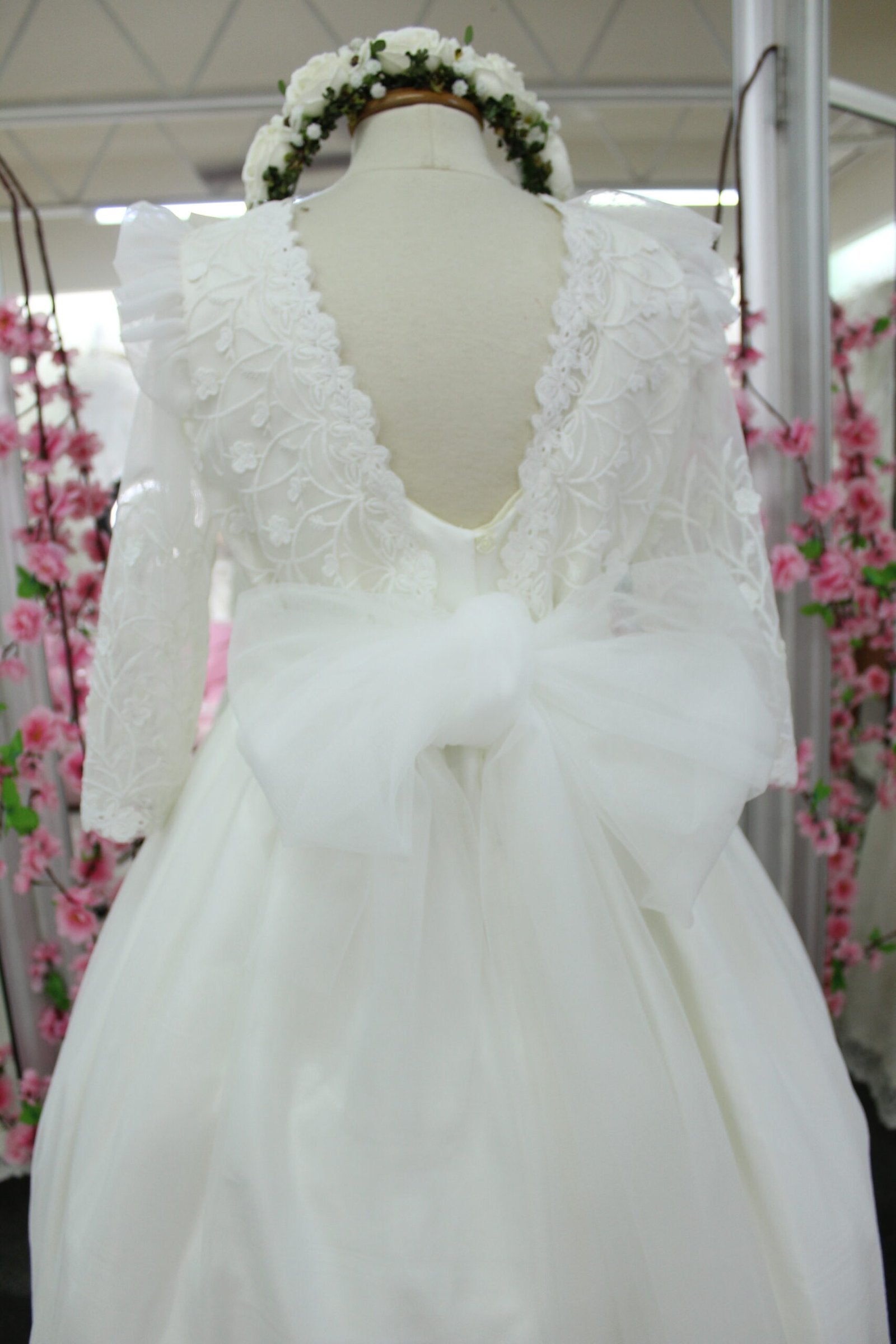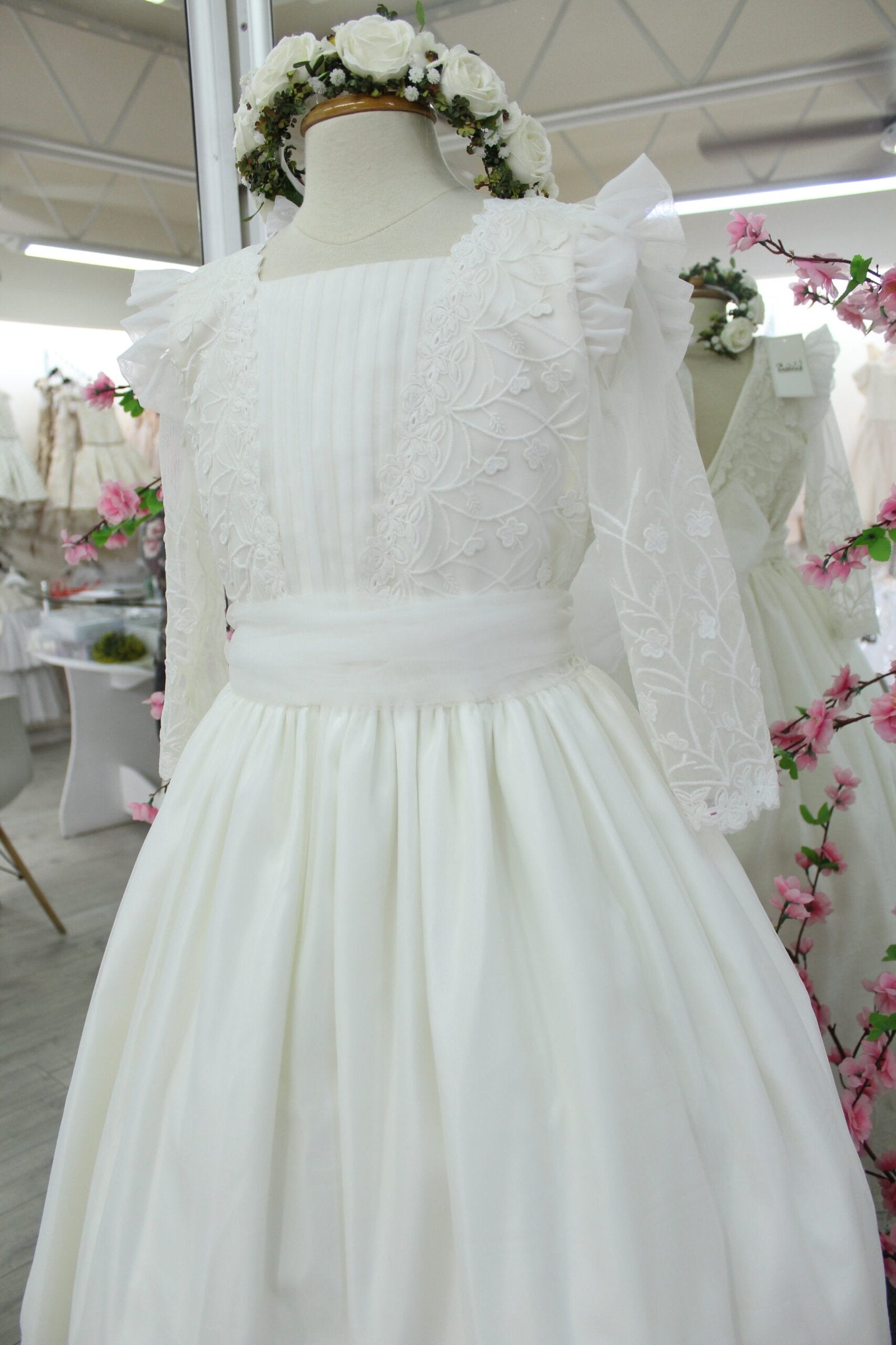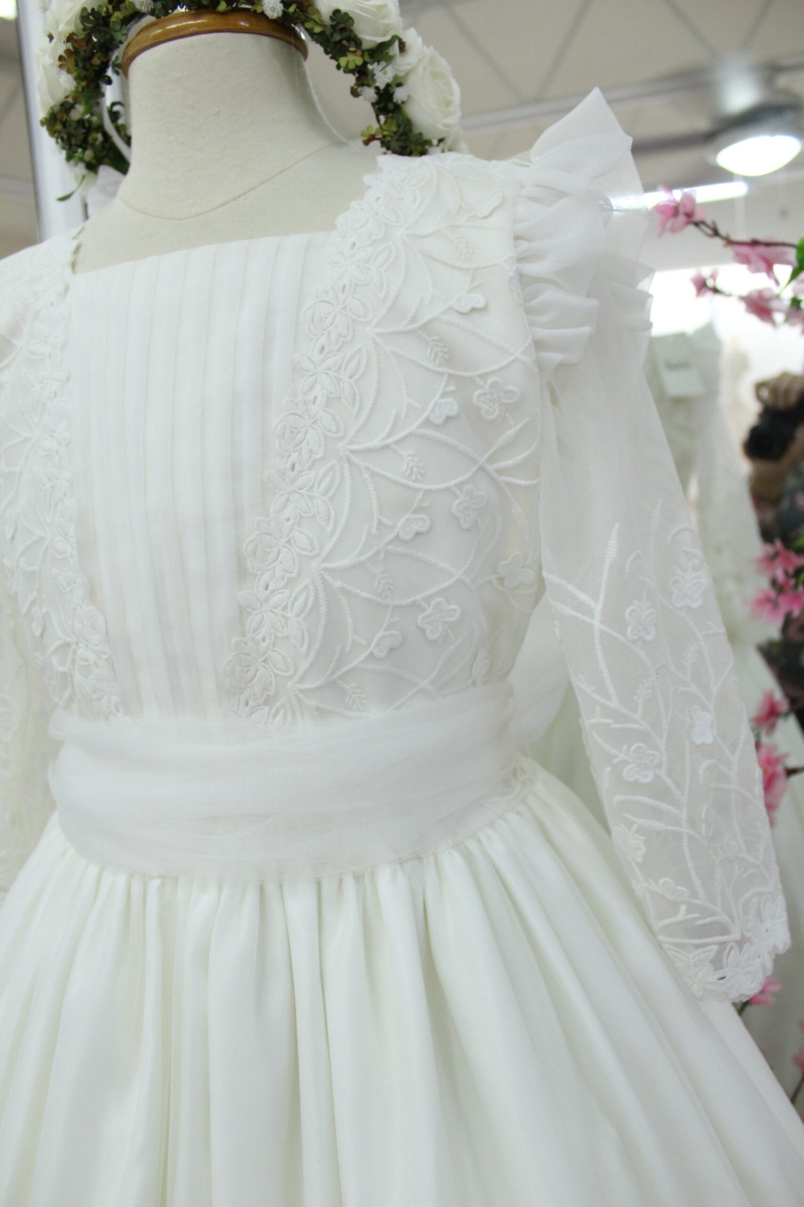 vestido primera comunión color perla la manga es desmontable, vestido con manga corta o manga larga la cual viene suelta para usarse como opción. Talle con alforzas al frente tela encaje, faldilla para amplitud de falda y espalda en V