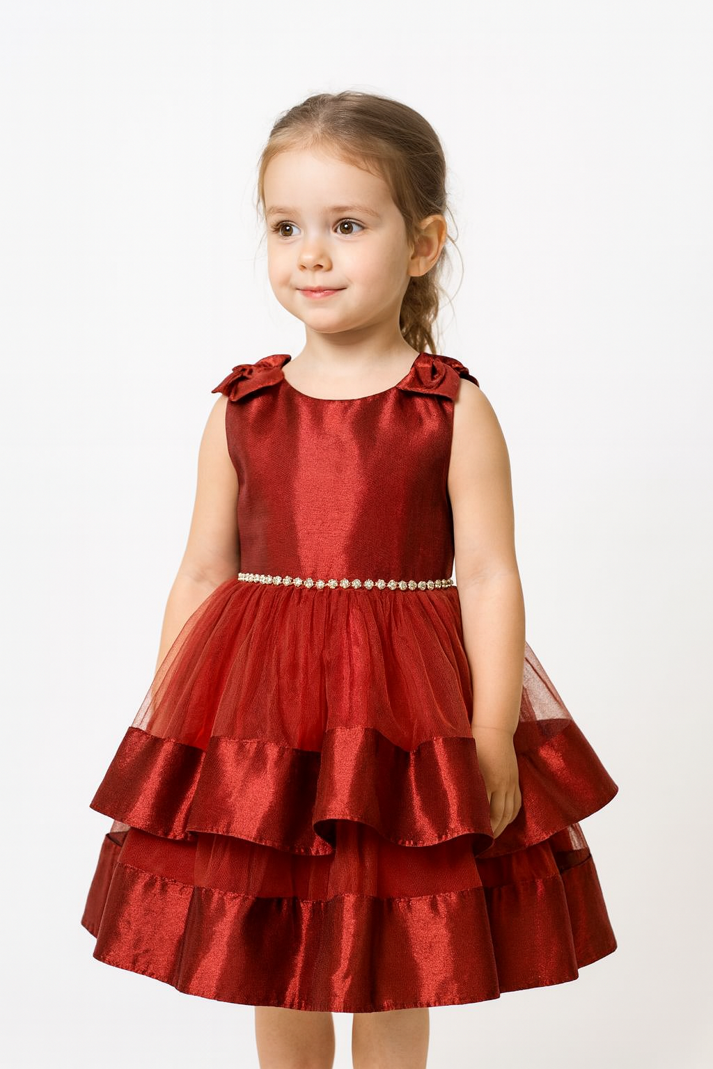 vestido saten rojo con cinto pequeñas flores doradas metálicas y dos olanes en la falda.